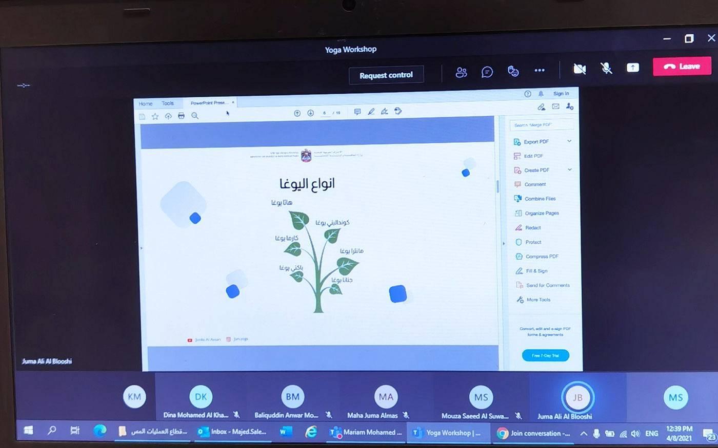 وركزت الورشة التي قدمتها المدربة الدولية المعتمدة جميلة الأنصاري عبر برنامج مايكروسوفت تيمز على عدة محاور، تضمنت تعريف «يوغا الهاثا» والمبادئ الثمانية لليوغا التي ذكرها الفيلسوف (باتانجالي)، وكيف تعزز الصحة النفسية والجسدية وتقوية المناعة في زمن جائحة «كوفيد 19»، وتعريف «الشاكرات» السبع، أو مراكز الطاقة السبعة الموجودة في الجسم، ووضعيات «الأسانا» (الجلوس) المناسبة لتوازن كل «شاكرا»، إضافة إلى فقرة عن التأمل والانعتاق.