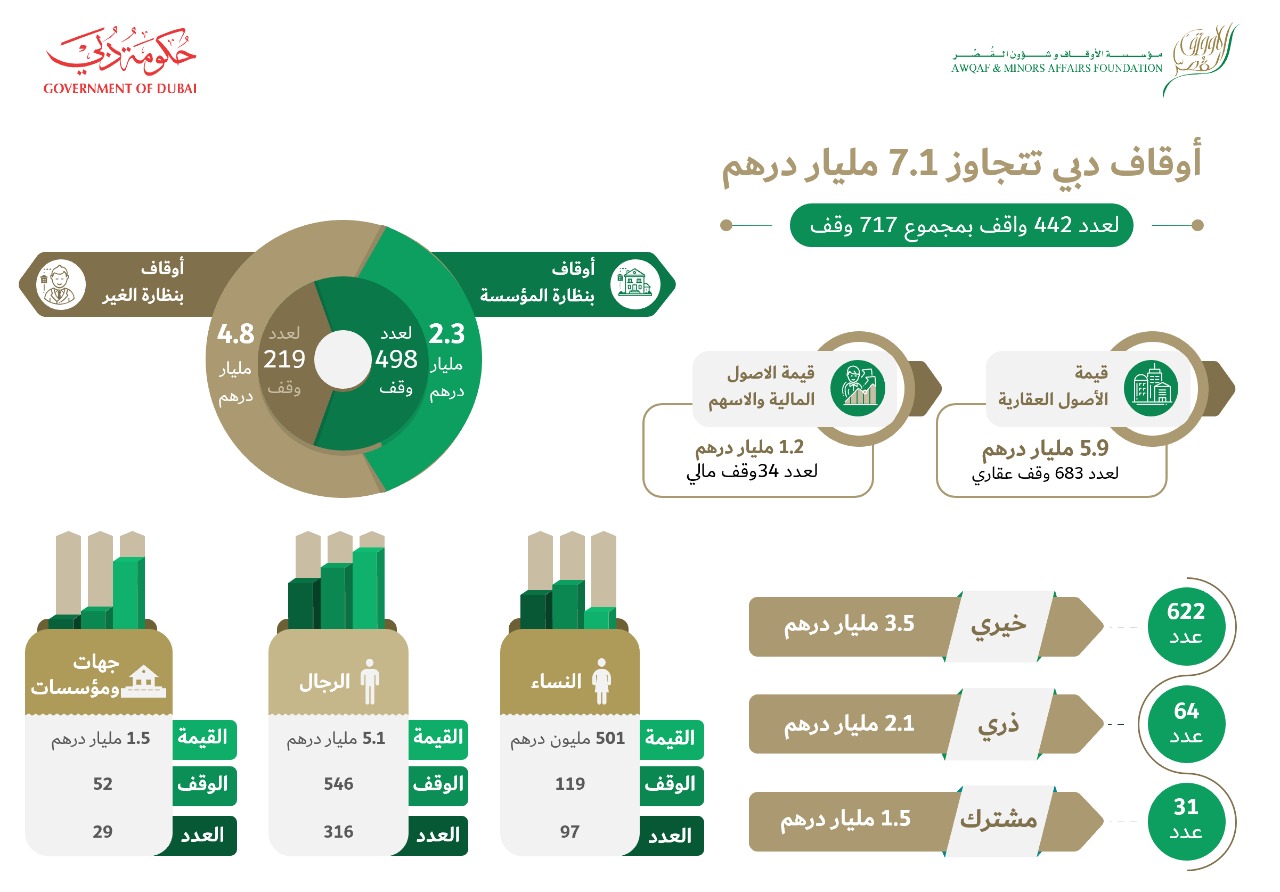 و سجلت مؤسسة الأوقاف وشؤون القصر في دبي بنهاية عام 2020 الوقف رقم 717، لتتجاوز بذلك قيمة إجمالي أصول الأوقاف المسجلة لديها في الإمارة، سبعة مليارات درهم، وتعود الأوقاف إلى 442 واقفا وواقفة، سجلوها لدى المؤسسة.
