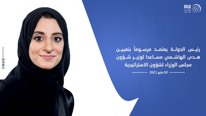 اعتمد صاحب السمو الشيخ خليفة بن زايد آل نهيان رئيس الدولة "حفظه الله" مرسوماً اتحادياً بتعيين سعادة هدى الهاشمي مساعداً لوزير شؤون مجلس الوزراء لشؤون الاستراتيجية.
