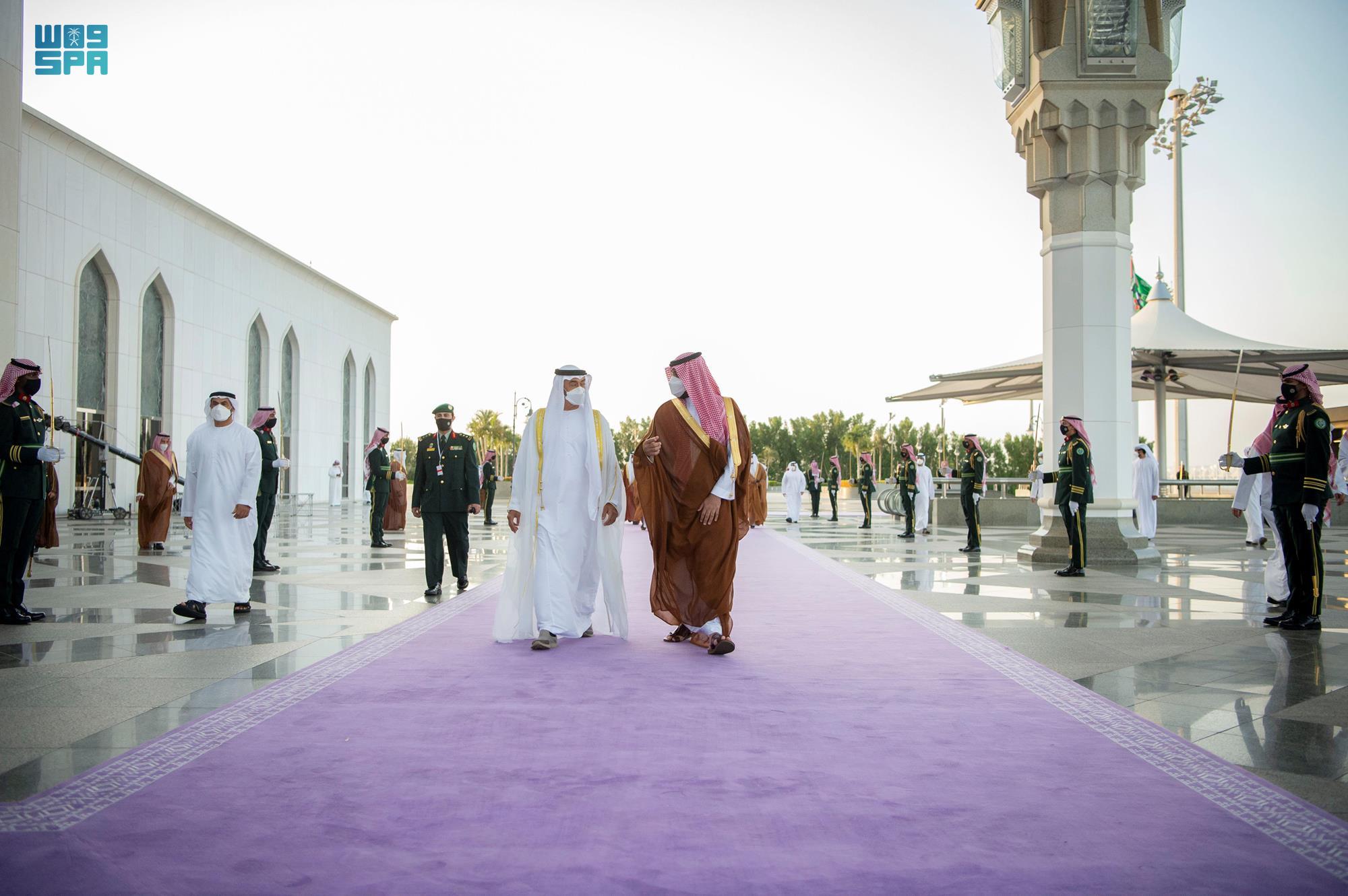 ويرافق صاحب السمو الشيخ محمد بن زايد خلال الزيارة .. سمو الشيخ طحنون بن زايد آل نهيان مستشار الأمن الوطني ومعالي علي بن حماد الشامسي نائب الأمين العام للمجلس الأعلى للأمن الوطني وسعادة محمد مبارك المزروعي وكيل ديوان ولي عهد أبوظبي و سعادة الشيخ نهيان بن سيف بن محمد آل نهيان سفير الدولة لدى المملكة العربية السعودية.