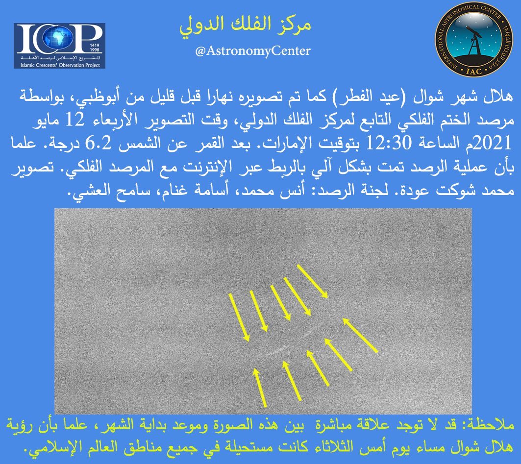 نشر مركز الفلك الدولي عبر حسابه بتويتر، صورة لهلال شهر شوال "عيد الفطر" تم تصويره نهارا قبل قليل من أبوظبي.
