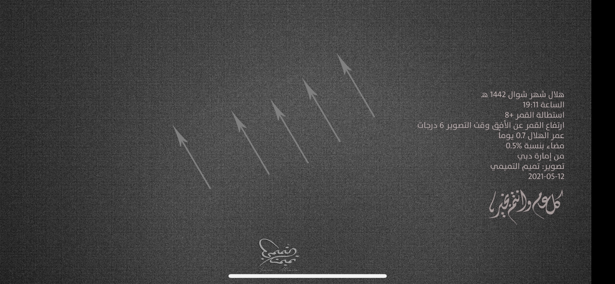 نشر مركز الفلك الدولي  صورة لهلال شهر شوال 1442 هـ من إمارة دبي بعد غروب الشمس اليوم الأربعاء 12 مايو 2021م في الساعة 19:11 وكانت استطالة القمر 8.3 درجات وارتفاعه عن الأفق  4 درجات وعمر الهلال 0.8 يوماً  ومكث الهلال 38 دقيقة .
