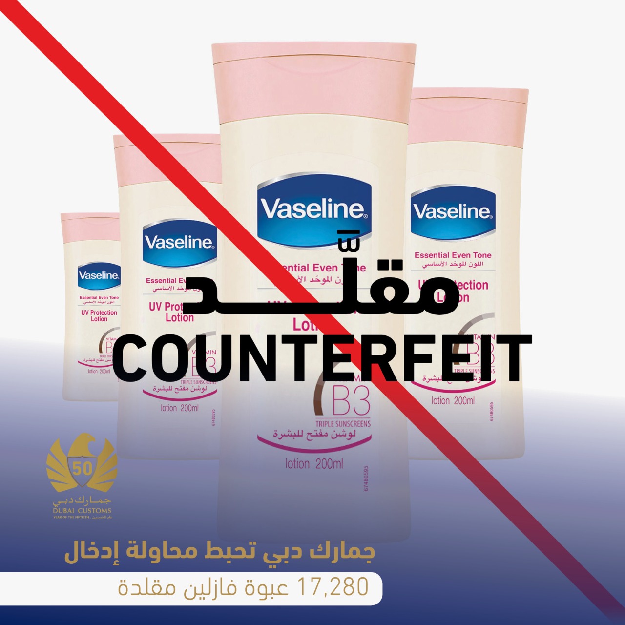 وقال يوسف عزيز مبارك مدير إدارة حماية حقوق الملكية الفكرية في جمارك دبي: " تتسبب البضائع المقلدة بأضرار كبيرة للمجتمع والاقتصاد معاً حين يستهدف التقليد والغش التجاري العلامات التجارية لمنتجات حيوية ، ولذلك أولينا كامل اهتمامنا للمعلومات التي وصلتنا حول محاولة إدخال بضائع مقلدة لشحنة قادمة من دولة اسيوية لعبوات تحمل شعار "فازلين" وهي عبوات مقلدة وتم اكتشافها من ضباط جمارك دبي بالرغم من حرفية التقليد، وبالتعاون والتنسيق مع إدارة الاستخبارات الجمركية وضعنا خطة محكمة لضبط الشحنة ومنع دخولها إلى الدولة لحماية مجتمعنا من المخاطر الصحية الناجمة عن استخدام هذه المواد المقلدة.