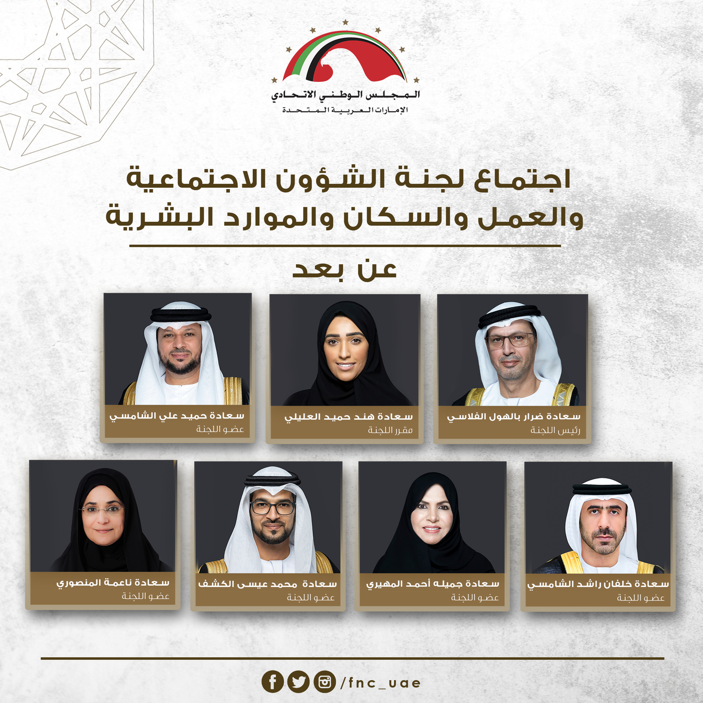 ناقشت لجنة الشؤون الاجتماعية والعمل والسكان والموارد البشرية للمجلس الوطني الاتحادي، خلال اجتماع عقدته عن بعد، برئاسة ضرار الفلاسي رئيس اللجنة، تقرير توصيات موضوع التلاحم الأسري ودوره في تحقيق أهداف التنمية الاجتماعية المستدامة، المحال من المجلس.