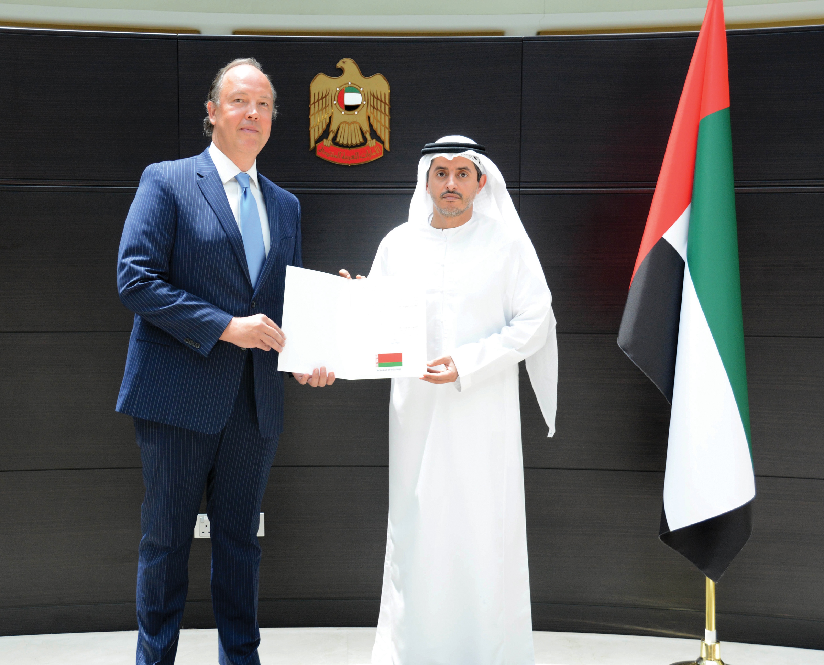 تسلم الشيخ مكتوم بن بطي آل مكتوم مدير مكتب وزارة الخارجية والتعاون الدولي في دبي، البراءة القنصلية ليفغيني لازاريف، القنصل العام لجمهورية بيلاروس في دبي، وذلك بمقر مكتب الوزارة بدبي.