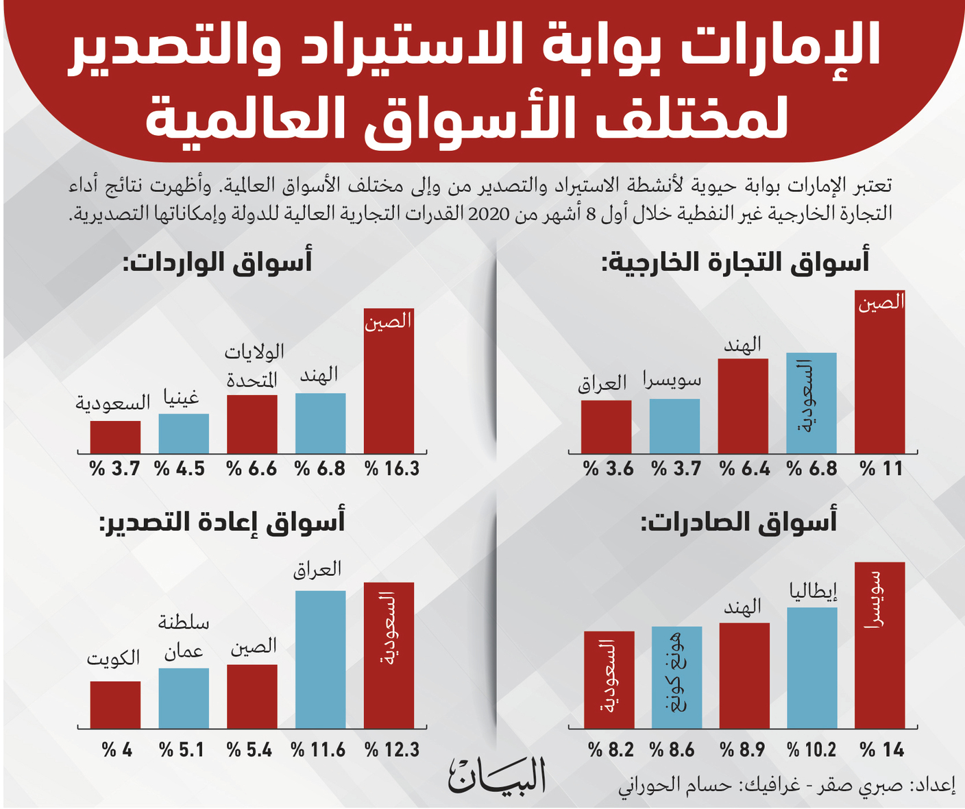 وحلت الصين كأول الشركاء التجاريين مع الإمارات في التسعة أشهر الأولى من العام الماضي بتبادل تجاري غير نفطي جاوز 124.45 مليار درهم، وثانياً السعودية بقيمة 90.8 ملياراً، وثالثاً الهند بقيمة 70 مليار درهم.