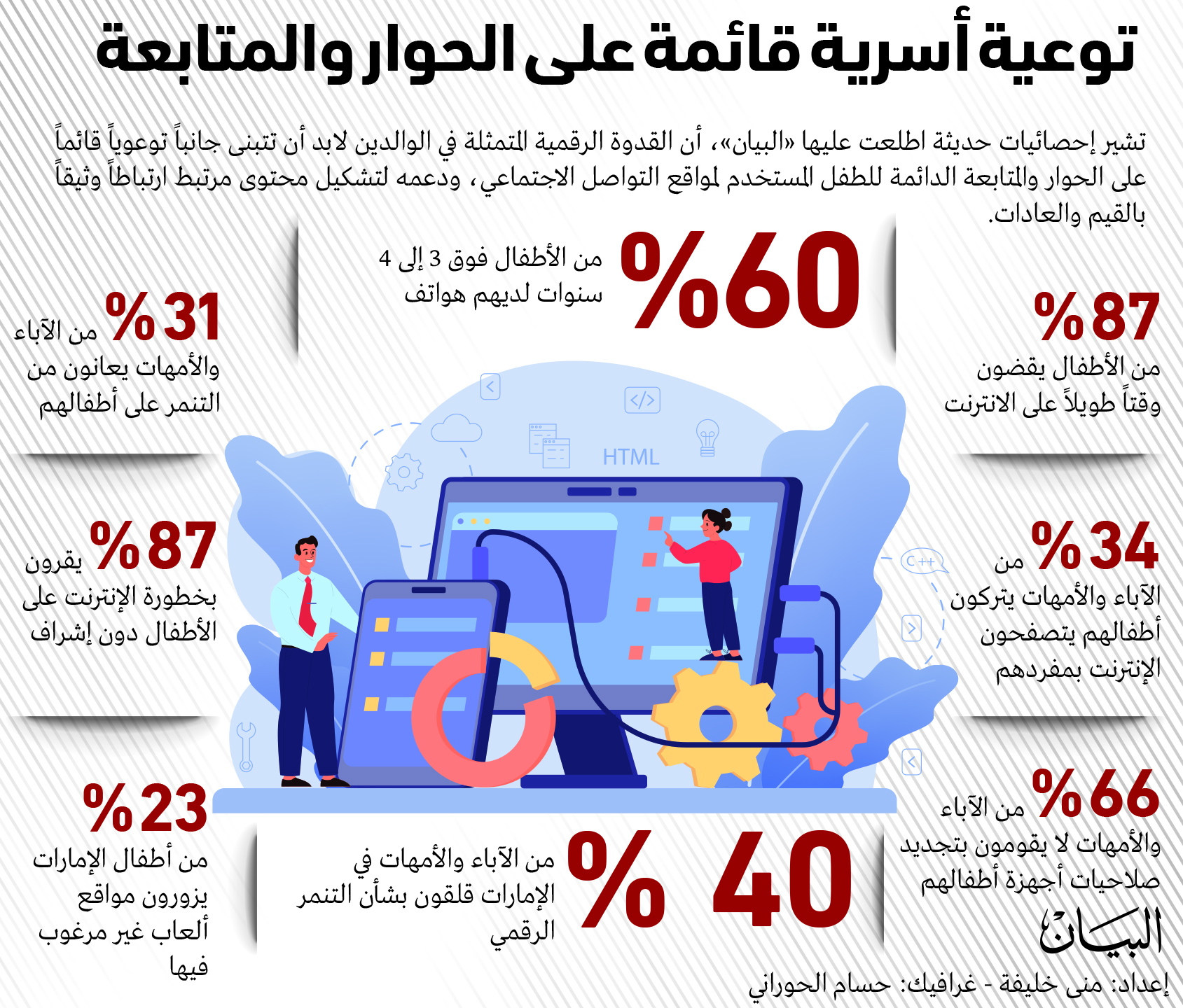 سلط تقرير صادر عن الاتحاد الدولي للاتصالات، وحصلت «البيان» على نسخة منه، الضوء على المبادئ التوجيهية لأولياء الأمور بشأن حماية الطفل على الإنترنت لعام 2020، تركزت في سبع خطوات أساسية لضبط استخدام الأطفال لـ«التواصل الاجتماعي»، وتتمثل في: وضع أسس واضحة في كيفية استخدام الأطفال مواقع التواصل الاجتماعي، ووضع ضوابط واضحة للمحتوى بما يتوافق مع القيم والدين والعادات، وأن يكون الوالدان قدوة حسنة لأبنائهما من خلال دعمهم ومتابعتهم الدائمة ليكون المحتوى المقدم هادفاً، وأن يكون الحوار الدائم بين الطفل ووالديه يسهم في الكشف المبكر عن علامات التنمر الإلكتروني، وتثقيف الوالدين لأبنائهما حول مخاطر وسائل التواصل الاجتماعي، واكتشاف مواهب الطفل لشغله ذهنياً وحركياً بما هو مفيد، وأخيراً؛ دعم الطفل وحثه على تطوير مهاراته ودخوله لبرامج تدريبية ليكون مؤهلاً للبيئة الافتراضية.