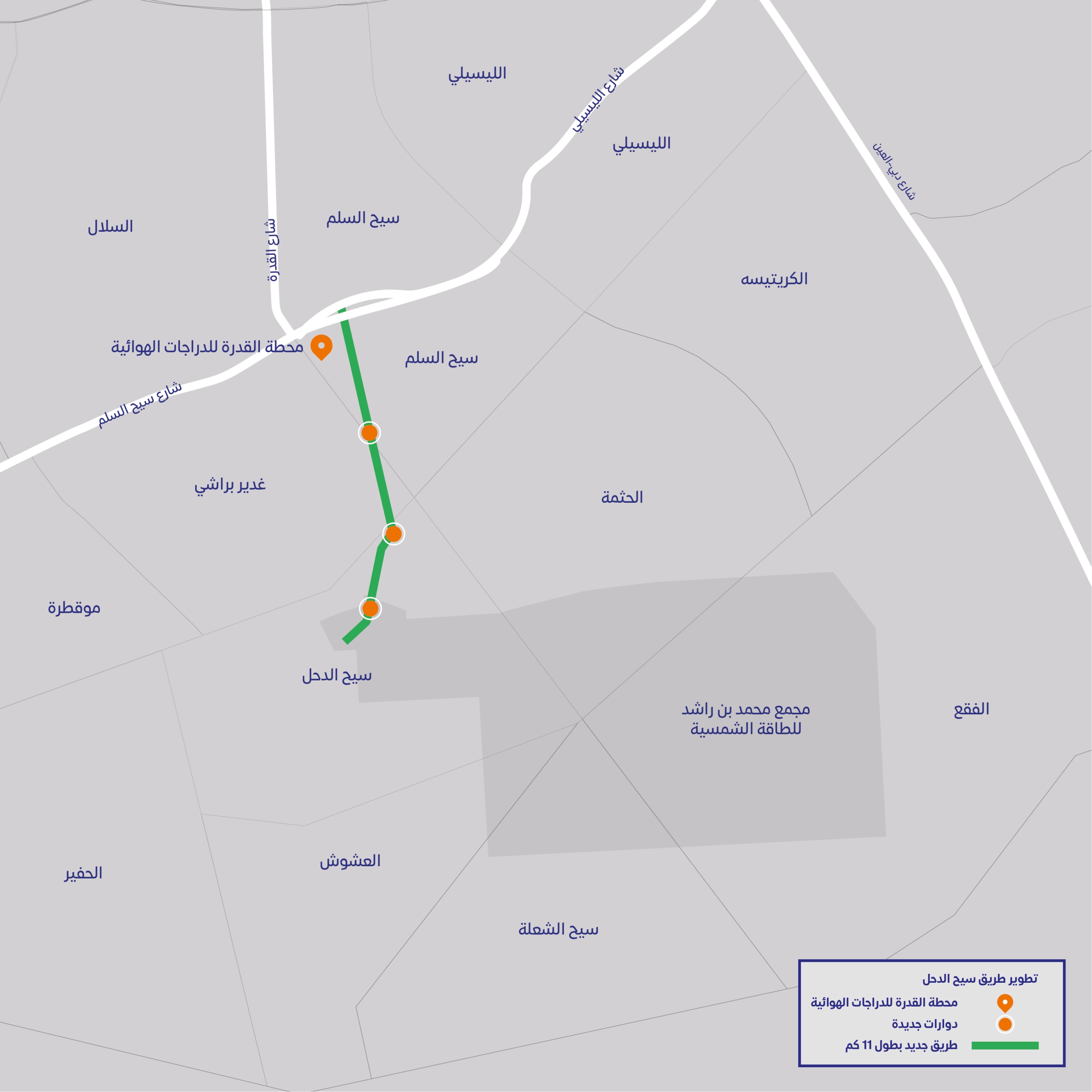 أرست هيئة الطرق والمواصلات عقد مشروع تطوير وتوسعة شارع سيح الدحل، الذي يربط بين شارع سيح السلم ومجمع محمد بن راشد آل مكتوم للطاقة الشمسية، حيث سيزال الطريق القائم المكون من مسار واحد بكل اتجاه، وسيتم تنفيذ طريق جديد بطول (11) كم يتألف من مسارين بكل اتجاه وجزيرة وسطية و(3) دوارات لتسهيل الحركة في جميع الاتجاهات وسيربط الطريق مع مداخل بحيرات القدرة.