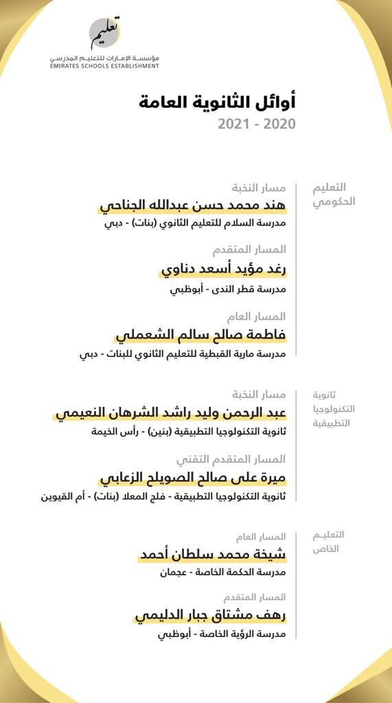 وقال سموه عبر حسابه في "تويتر"، "نبارك لأبنائنا طلاب الثانوية العامة تخرجهم.. ونخص بالتهنئة المتفوقين منهم.. ونشكر الميدان التربوي على تجاوزه سنة تعليمية غير اعتيادية.. والقادم أجمل بإذن الله في إمارات الخير".