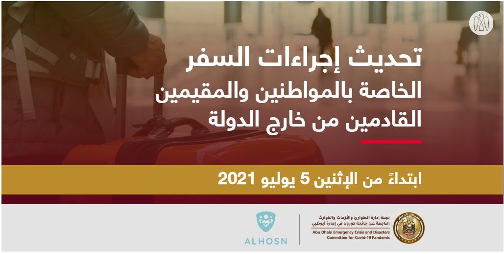أعلنت لجنة إدارة الطوارئ والأزمات والكوارث الناجمة عن جائحة كورونا في إمارة أبوظبي عن تحديث إجراءات السفر الخاصة بالمواطنين والمقيمين في الإمارة القادمين من خارج الدولة، ويبدأ العمل بها من يوم الإثنين الموافق 5 يوليو 2021.