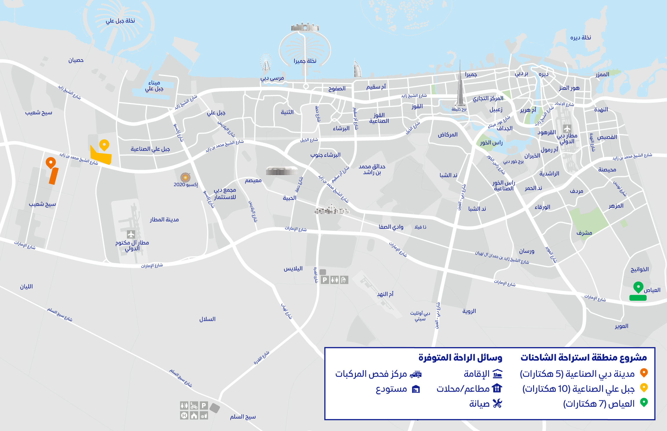 وأضاف: تبلغ مساحة الموقع الأول الذي يقع بالقرب من منطقة جبل علي الصناعية الثالثة باتجاه إمارة أبوظبي، 100 ألف متر مربع، وتتسع لعدد يتراوح من 170 إلى 200 شاحنة، فيما تبلغ مساحة الموقع الثاني الواقع على شارع الإمارات بالقرب من مدخل إمارة الشارقة ، 70 ألف متر مربع، وتتسع لعدد يتراوح من 130 إلى 150 شاحنة، أما الموقع الثالث فيقع في مدينة دبي الصناعية بالقرب من شارع الشيخ محمد بن زايد، وتبلغ مساحته 50 ألف متر مربع، ويتسع لعدد يتراوح من 90 إلى 100 شاحنة، وتشتمل المحطات المزمع إنشاؤها على حزمة متكاملة من الخدمات التي تلبي جميع الاحتياجات الأساسية واليومية لسائقي الشاحنات والمركبات الثقيلة، مثل مراكز فحص فني متخصصة للمركبات الثقيلة، ومراكز خدمات الصيانة، ومخازن، ومطاعم، ومحلات تجارية، واستراحات.