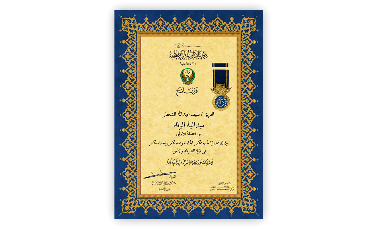 وقد سلم سموه الفريق الشعفار ميدالية الوفاء من الطبقة الأولى خلال الحفل الذي أقامته وزارة الداخلية خصيصاً لتكريم الشعفار في رسالة وفاء وتقدير لمسيرته المتميزة والخدمات الجليلة التي قدمها وتفانيه وإخلاصه خلال مسيرة عمله في المجالات الشرطية والأمنية.