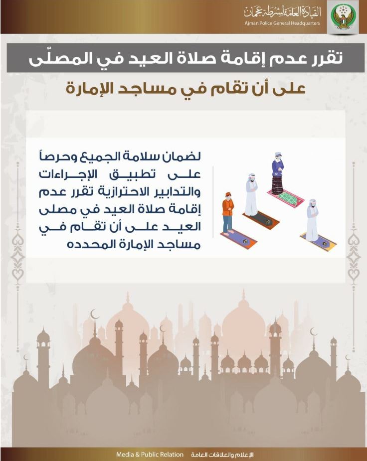 عجمان تقرر إقامة صلاة العيد في مساجد محددة عجمان – عصام الدين عوض قررت الجهات المختصة في عجمان ولضمان سلامة الجميع وحرصاً على تطبيق الاجراءات والتدابير الاحترازية عدم اقامة صلاة العيد في مصلى العيد بالإمارة، على أن تقام في مساجد الإمارة المحددة.