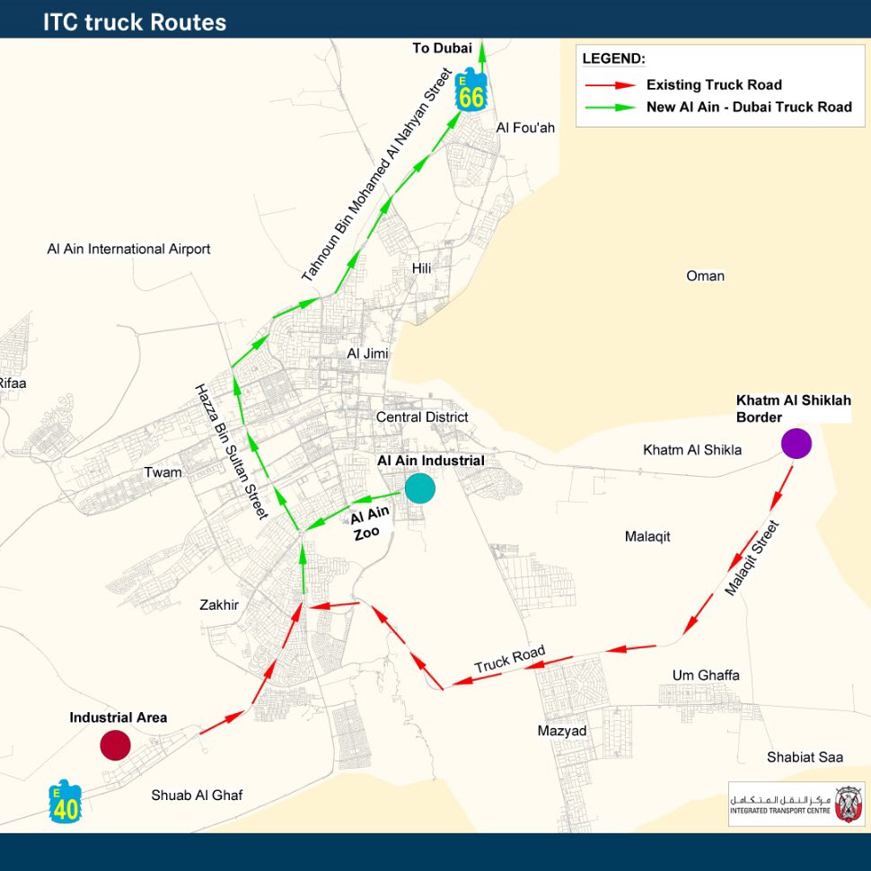 أعلن مركز النقل المتكامل، وبالتعاون مع بلدية مدينة العين، والقيادة العامة لشرطة أبوظبي، أنه سيسمح، اعتباراً من أمس، بتنقل الشاحنات من وإلى إمارة دبي، باستخدام طريق طحنون بن محمد آل نهيان (العين - دبي/ E66)، مروراً بشارع هزاع بن سلطان في مدينة العين، خارج أوقات الذروة، من الساعة 10:00 مساء وحتى الساعة 6:00 صباحاً، على أن لا يتجاوز الحد الأقصى الكلي لوزن الشاحنة المسموح به 45 طناً.