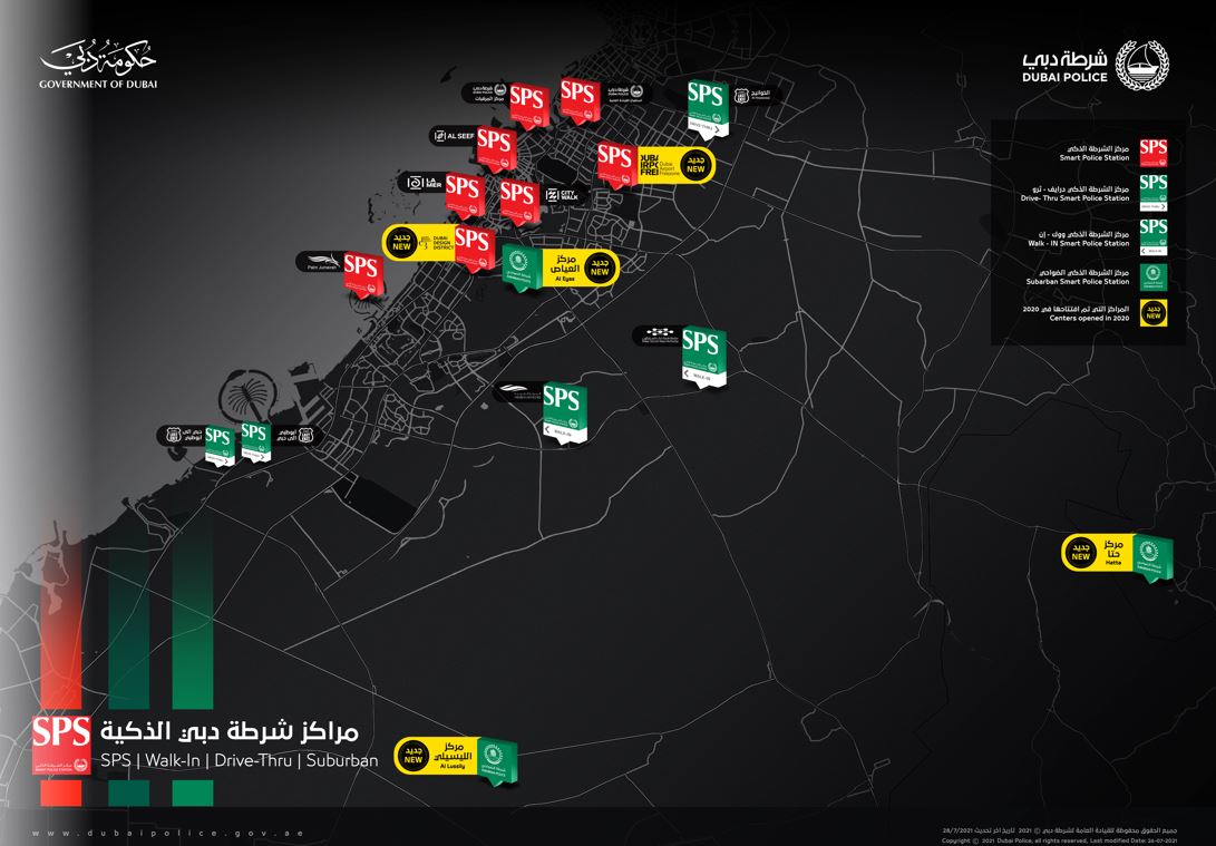 وتقدم المراكز باقة متعددة من الخدمات الجنائية والمرورية والمجتمعية يصل عددها إلى 45 خدمة، يختلف مكان تقديم بعضها باختلاف المركز، سواء كان SPS، أو "درايف ثرو" أو "ووك إن"، ويقدمون بـ 7 لغات مختلفة على مدار 24 ساعة وطيلة أيام الأسبوع، بهدف تقديم خدمات تسهم في تعزيز الإحساس بالأمن والأمان ورفع جودة الحياة والمساهمة في جعل مدينة دبي الأذكى والأسعد عالمياً.