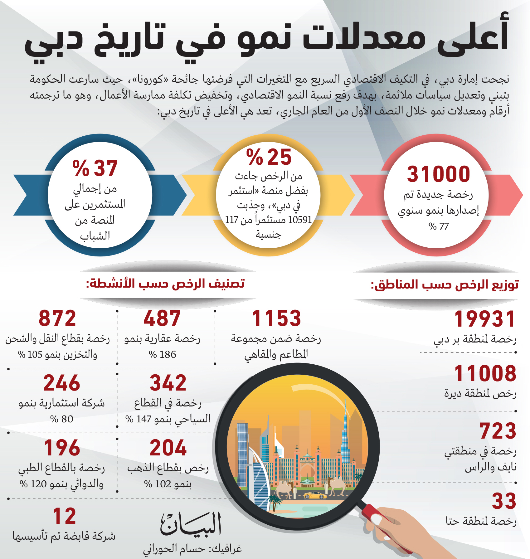 جاء ذلك خلال إطلاق التقرير نصف السنوي لحركة الأعمال الصادر عن قطاع التسجيل والترخيص التجاري في دائرة التنمية الاقتصادية، والذي كشف عن أرقام ومعدلات نمو هي الأعلى في تاريخ إمارة دبي، على مستوى عدد التراخيص التجارية التي أصدرتها الإمارة بمعدلات تفوق بشكل كبير مرحلة ما قبل الجائحة العالمية، حيث تم إصدار 31,000 رخصة جديدة خلال النصف الأول من عام 2021، بنمو قدره 77% مقارنةً مع الفترة عينها لعام 2020، حيث تم إصدار 17,478 رخصة، ويعد هذا الإنجاز انعكاساً حقيقياً للتسهيلات المتعلقة بمزاولة الأعمال، وتبسيط الاشتراطات والإجراءات، بالإضافة إلى التملك الكامل للمستثمرين الأجانب، والذي يعد خطوة محورية نحو تحقيق رؤية وتوجيهات صاحب السمو الشيخ محمد بن راشد آل مكتوم، نائب رئيس الدولة رئيس مجلس الوزراء حاكم دبي، رعاه الله، لزيادة استقطاب الاستثمار الأجنبي المباشر إلى مختلف القطاعات الحيوية في الدولة، والارتقاء بتنافسية بيئة الأعمال إلى مستويات رائدة عالمياً، وبما يواكب مستهدفات الدولة للخمسين عاماً المقبلة.