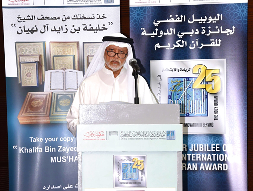 عبر المستشار إبراهيم محمد بو ملحه مستشار صاحب السمو حاكم دبي رئيس اللجنة المنظمة لجائزة دبي الدولية للقرآن الكريم رئيس اللجنة العليا لمصحف الشيخ خليفة بن زايد آل نهيان عن شكره وتقديره لجميع الجهود التي بذلت لإنجاز كتابة وطباعة ومراجعة وتوزيع الطبعة الأولى من مصحف الشيخ خليفة بن زايد آل نهيان، جاء ذلك في الاحتفال بإنجاز المصحف والبدء بتوزيعه والذي أقيم في مقر الجائزة بمنطقة الممزر بحضور أعضاء اللجنة المنظمة للجائزة وأعضاء اللجان العاملة في إنجاز وطباعة المصحف، وفي بداية اللقاء ألقى المستشار إبراهيم محمد بو ملحه كلمة قال فيها: «أشكركم جزيل الشكر وأعظمه على هذا الجهد الكبير الذي بذلتموه لإنجاز عمل من أعظم وأجل وأبرك الأعمال ألا وهو إنجاز مصحف الشيخ خليفة بن زايد آل نهيان، الذي تشرفنا جميعاً بعقده الثمين الذي أهداه لنا صاحب السمو الشيخ محمد بن راشد آل مكتوم نائب رئيس الدولة رئيس مجلس الوزراء حاكم دبي، رعاه الله، حينما كلف سموه جائزة دبي الدولية للقرآن الكريم بإنجاز هذا المصحف إثر تكريم صاحب السمو الشيخ خليفة بن زايد آل نهيان رئيس الدولة، حفظه الله، بجائزة شخصية العام الإسلامية إذ أمر سموه في هذه المناسبة الكريمة بكتابة وطباعة هذا المصحف وإسناد العمل للجائزة من الإشراف على كتابته وطباعته وتوزيعه ومن لحظتها بدأت الجهود الطيبة حثيثة من خلال اختيار أعضاء اللجنة الإدارية المشرفة على هذا العمل إذ قامت باختيار أساتذة مختصين في الخط العربي لاختيار الخطاط الذي سيقوم بهذا العمل وذلك لمدى معرفتهم بهذا الجانب وتخصصهم فيه وقد رشحوا لذلك أمهر الخطاطين من أصحاب الجمال والتميز في هذا الفن الإبداعي كما تم اختيار المزخرف الذي سيطلع بمهمة الزخرفة ذات الذوق والإبداع والتميز ولقد توفقت اللجنة المشرفة بحسن اختيار أعضاء اللجنة الشرعية التي تولت مهمة التدقيق على كتابة المصحف فاختارت لذلك علماء أفاضل في القراءات والرسم إذ بذلوا جهداً كبيراً وأداءً متميزاً يقدرون ويشكرون عليه كما لا ننسى العلماء الأفاضل أعضاء لجنة المراجعة النهائية أثناء وبعد طباعة المصحف للتأكد من سلامة الطباعة ودقتها كما يشرفني في الختام أن أثني على ما قامت به اللجنة المشرفة على هذا العمل الجليل من متابعة وما اتسمت به من الوقوف على تفاصيله وتسهيل إجراءاته».. كما أن الشكر موصول لكل من قام بعمل ولو كان بسيطاً لكونه يكبر في عيوننا لمساهمته في إنجاز هذا المصحف الذي وفقنا الله تعالى بأن اختارنا لهذه الغاية السامية التي شرفنا بها.. ونرجو من الله تعالى حسن القبول إنه سميع مجيب.