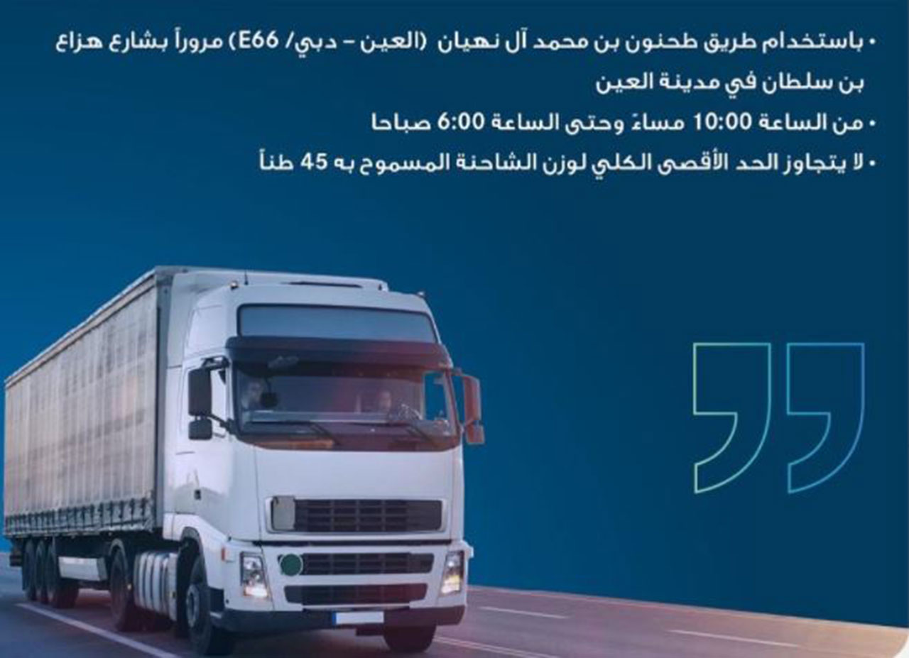 وتقرر السماح بتنقل الشاحنات من وإلى إمارة دبي باستخدام طريق طحنون بن محمد آل نهيان (العين – دبي E66) مروراً بشارع هزاع بن سلطان في مدينة العين، على ألا يتجاوز الحد الأقصى لوزن الشاحنة 45 طناً.