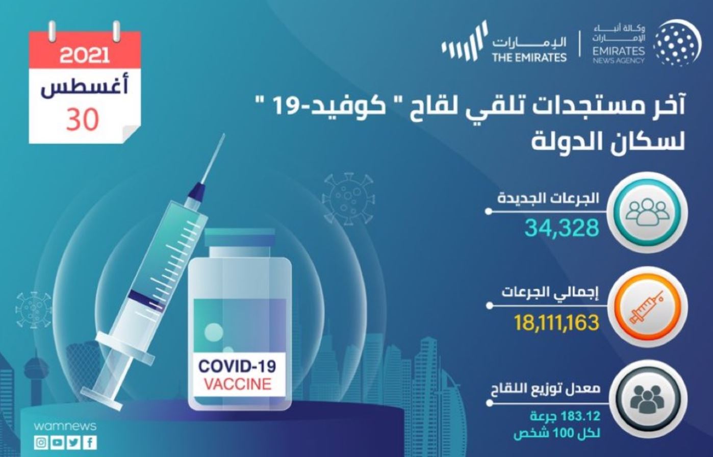 أعلنت وزارة الصحة عن تقديم 34,328 جرعة لقاح كوفيد19 خلال الـ24 ساعة الماضية، ليبلغ عدد الجرعات الكلي 18,111,163 بمعدل توزيع 183.12 جرعة لكل 100 شخص. وبنسبة 86.84% لمتلقي الجرعة الأولى، ونسبة 75.82% لمتلقي جرعتين من إجمالي السكان في دولة الإمارات.