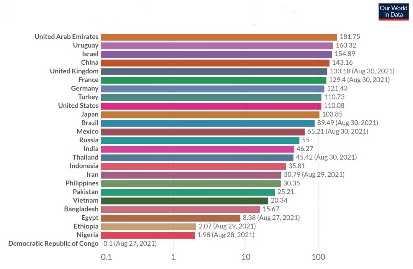 ووفقا لبيانات الموقع فقد جاءت الأوروغواي في المركز الثاني بمعدل 158.92 جرعة لكل 100 من السكان، يليها اسرائل بمعدل تطعيم 154.89 جرعة لكل 100 من السكان، واحتلت الصين المركز الرابع بمعدل 142.36 جرعة لكل 100 من السكان، وجاءت المملكة المتحدة في المركز الخامس بمعدل 133.18 جرعة، واحتلت فرنسا المركز السادس عالميا بواقع 129.4 جرعة، ثم ألمانيا بمعدل 121.16 جرعة، بينما احتلت الولايات المتحدة الأمريكية المركز الثامن بمعدل 109.88 جرعة، ثم تركيا بمعدل 109.73جرعة، بينما جاءت اليابان في المركز العاشر بواقع 102.15 جرعة لكل 100 من السكان.