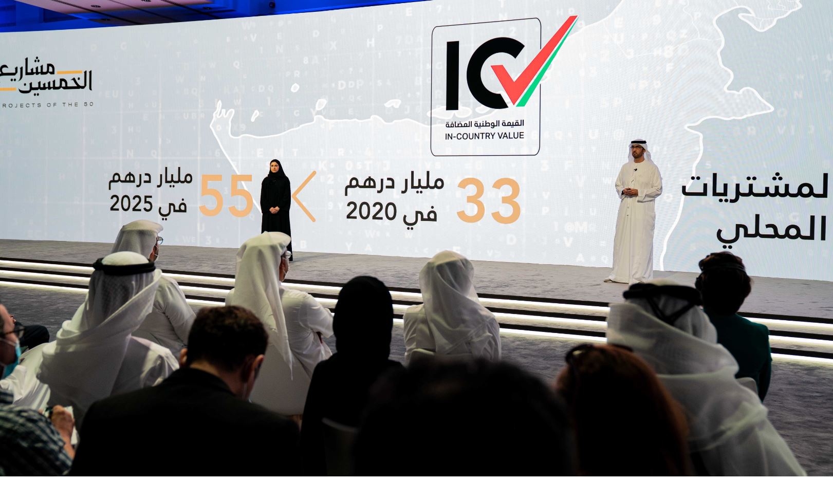 يهدف برنامج القيمة الوطنية المضافة ضمن "مشاريع الخمسين"، إلى المساهمة في دفع عجلة التنمية في الدولة للدولة من خلال إعادة توجيه أكثر من 42% من مشتريات الجهات الاتحادية والشركات الوطنية الكبرى نحو المنتج والخدمات الوطنية. ويتضمن المشروع زيادة عدد الموردين المعتمدين من 5000 إلى 7,300 شركة، ورفع المشتريات من 33 إلى 55 مليار درهم خلال أربع سنوات، بما يوفر بيئة داعمة لنمو الشركات الصغيرة والمتوسطة التي ستستفيد من توطين المشتريات لتعزيز دورها وأعمالها.