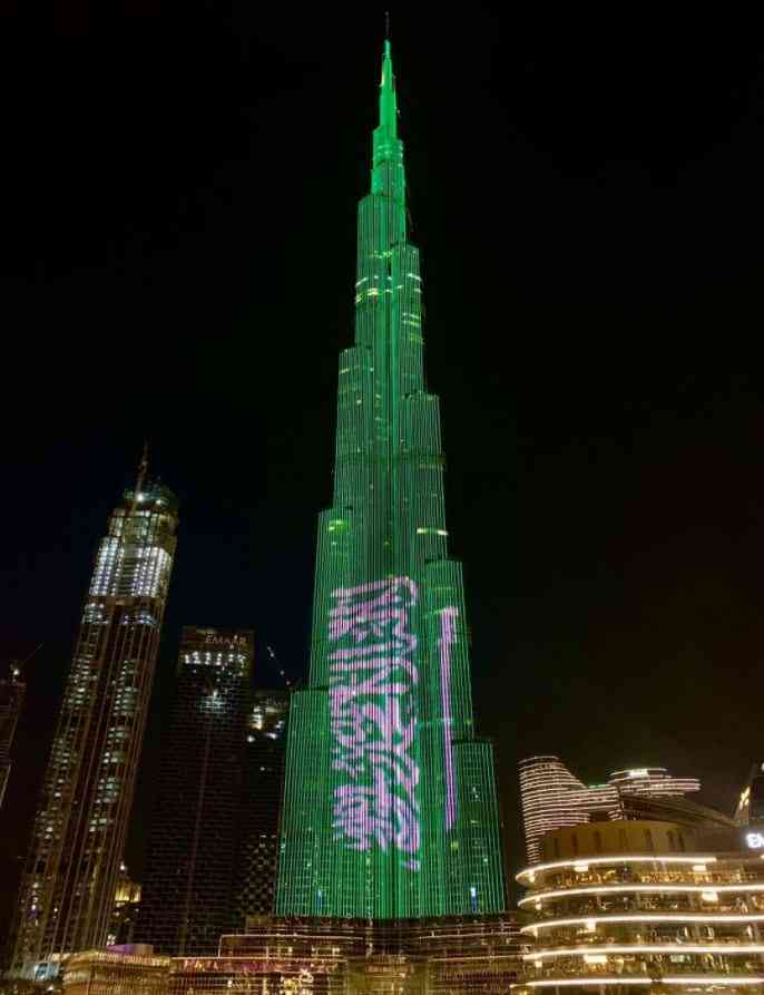 وتزين برج خليفة بإضاءة للعلم السعودي مع رسالة احتفالية، فيما قدمت نافورة دبي عرضا مصمما خصيصا على أنغام النشيد الوطني السعودي في حين أبهرت عجلة عين دبي الترفيهية على جزيرة بلوواترز الجمهور من خلال عروض الإسقاط الضوئي التي تحمل طابع المملكة العربية السعودية مع الوسم الرسمي الخاص باليوم الوطني السعودي.