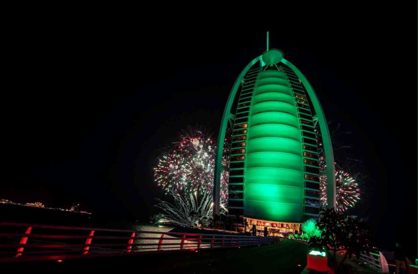 كما استضاف فندق برج العرب عرضا خاصا باللون الأخضر استمر ثلاث دقائق، فيما أضاء كل من برواز دبي ومتحف المستقبل باللون الأخضر في حين شهد دبي فستيفال سيتي مول فقرةً خاصة باليوم الوطني السعودي في الوقت الذي أسعدت نافورة النخلة زوار ذا بوينت بعروضها الخاصة.