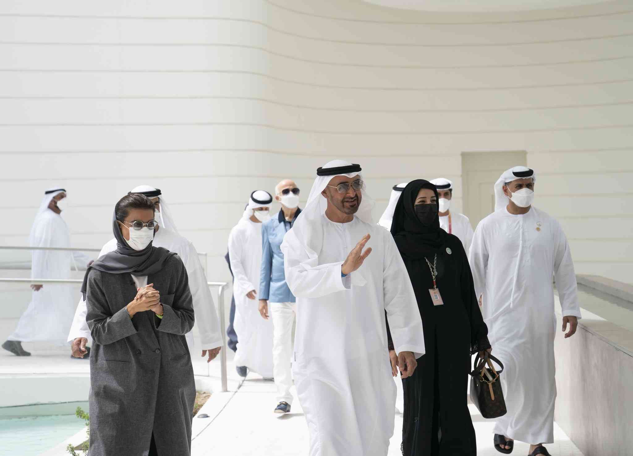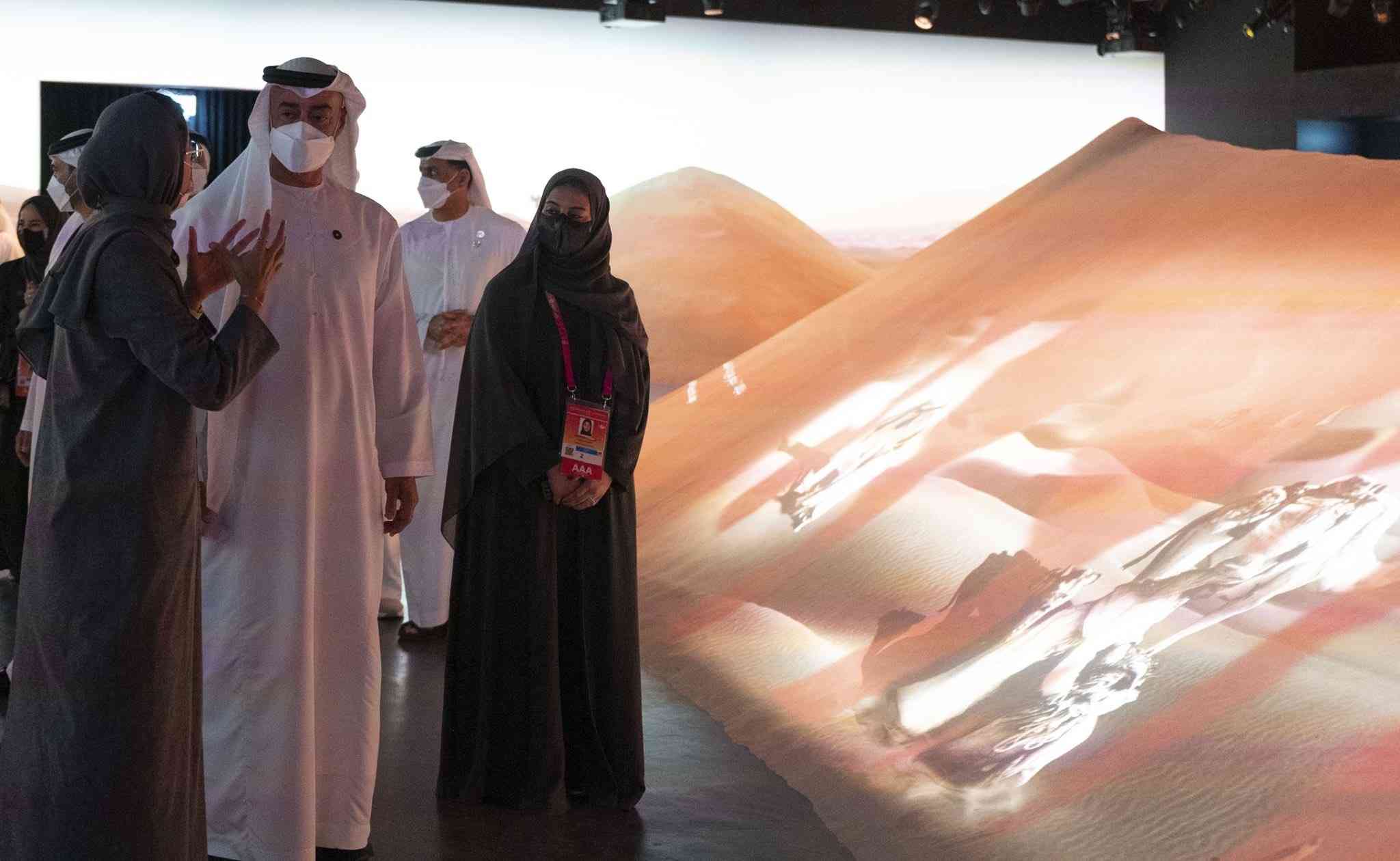 صاحب السمو الشيخ محمد بن زايد آل نهيان ولي عهد أبوظبي نائب القائد الأعلى للقوات المسلحة يرافقه معالي نورة بنت محمد الكعبي ومعالي ريم الهاشمي في زيارة لجناح الإمارات بـ #إكسبو_2020_دبي@expo2020dubai pic.twitter.com/HO6RL8SfD7