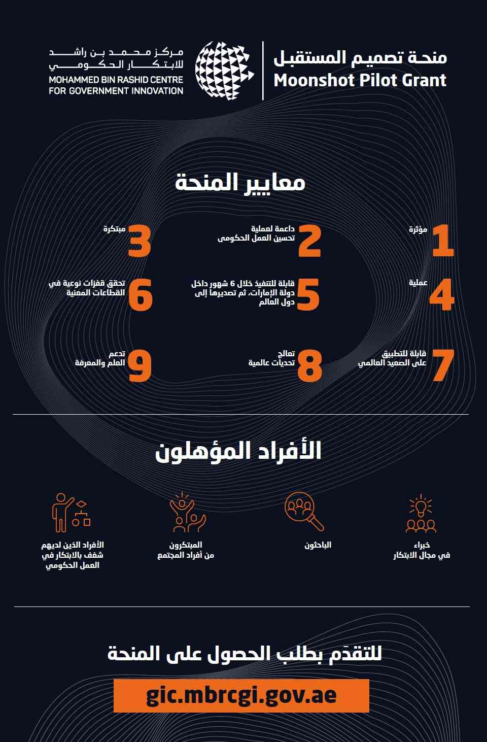 وتفتح المنحة المجال أمام خبراء الابتكار، والباحثين، والمبتكرين من أفراد المجتمع، وأصحاب الأفكار الخلاقة في الجهات الحكومية، لتقديم أفكارهم وتطويرها عبر الموقع الإلكتروني المخصص لمنحة تصميم المستقبل: https://gic.mbrcgi.gov.ae/، واختبار هذه الأفكار بما يضمن تسريع عملية الابتكار في العمل الحكومي، وخلق بيئة داعمة للابتكارات والمبادرات الحكومية الريادية.