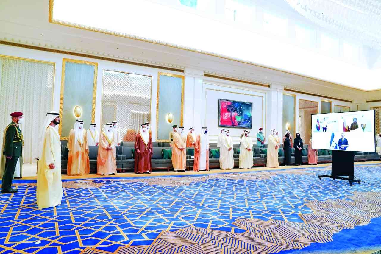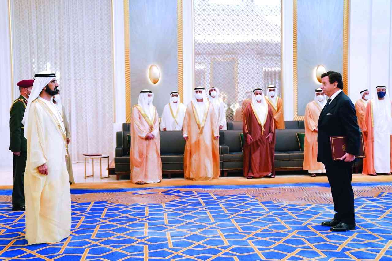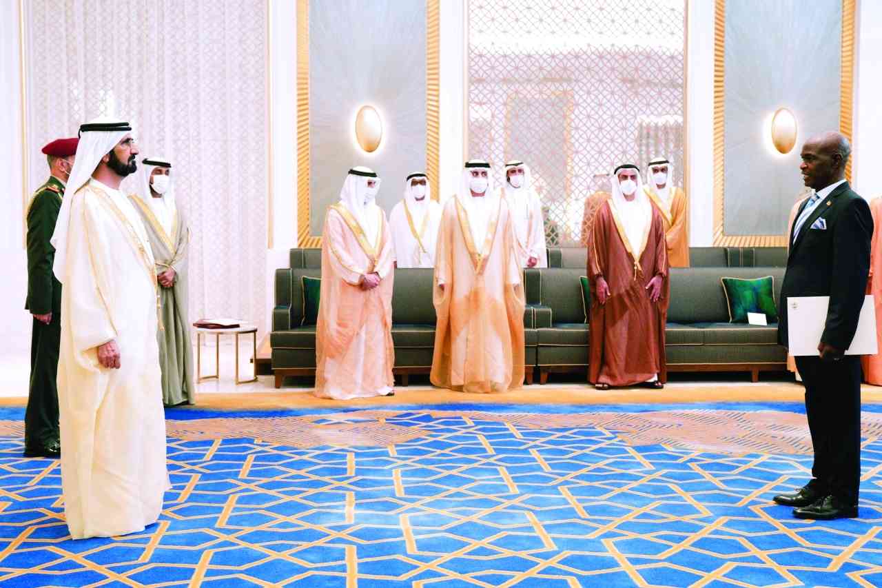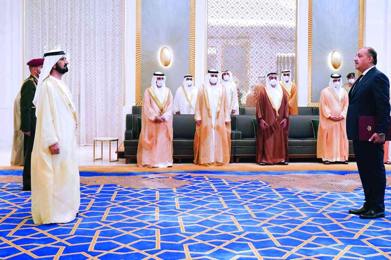 تسلّم صاحب السمو الشيخ محمد بن راشد آل مكتوم نائب رئيس الدولة رئيس مجلس الوزراء حاكم دبي، رعاه الله، بحضور سمو الشيخ حمدان بن محمد بن راشد آل مكتوم ولي عهد دبي، وسمو الشيخ مكتوم بن محمد بن راشد آل مكتوم نائب حاكم دبي، نائب رئيس مجلس الوزراء، وزير المالية، والفريق سمو الشيخ سيف بن زايد آل نهيان نائب رئيس مجلس الوزراء، وزير الداخلية، وسمو الشيخ منصور بن زايد آل نهيان نائب رئيس مجلس الوزراء، وزير شؤون الرئاسة، وسمو الشيخ عبد الله بن زايد آل نهيان وزير الخارجية والتعاون الدولي، أوراق اعتماد سفراء عدد من سفراء الدول الشقيقة والصديقة، المُعيّنين لدى الدولة، وذلك خلال استقبال سموه لهم، في مقر إكسبو 2020 دبي.
