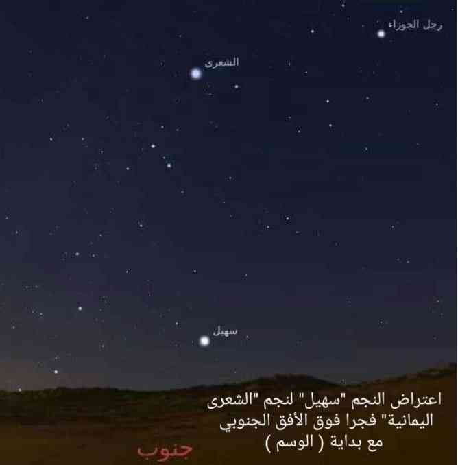 ويستدل العرب على دخول الوسم، بما يطلق عليه «تعرض النجم سهيل لنجم الشعرى اليمانية»، أي تعامدهما وقت الفجر فوق الأفق الجنوبي. كما يستدل بطلوع النجم السابع من نجوم بنات نعش أو كوكبة الدب الاكبر و الذي يطلق عليه ( القائد ) و يعرف ب " الاكيذب" و ب " السويبع" .