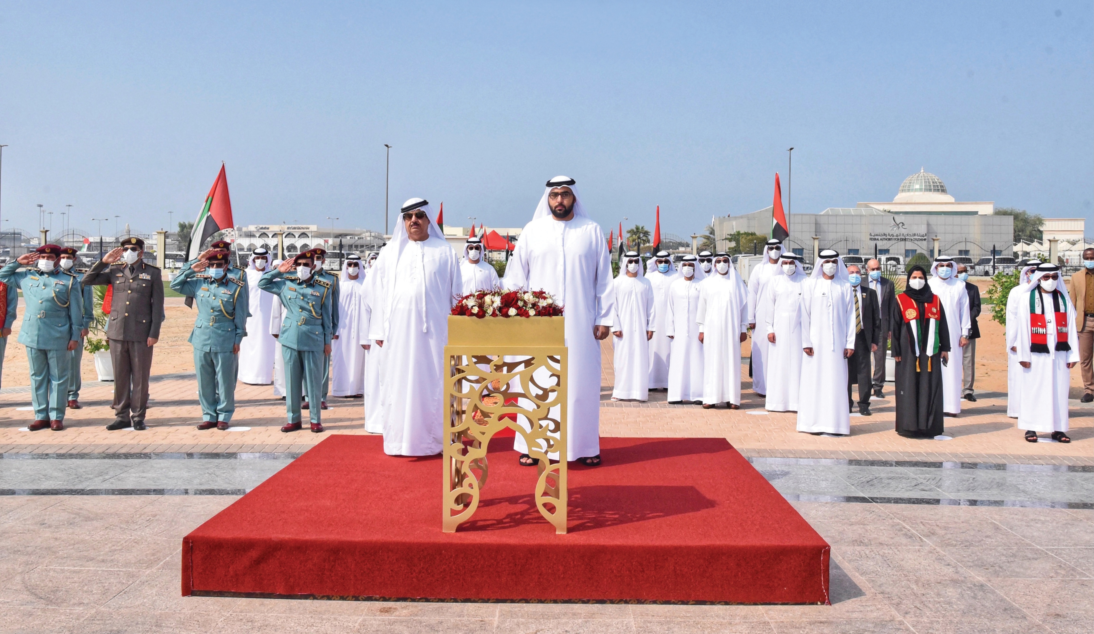 وقام سموه برفع علم الدولة في حديقة الخور بأم القيوين بحضور الشيخ حميد بن أحمد المعلا، والشيخ سيف بن راشد المعلا رئيس دائرة التنمية الاقتصادية في أم القيوين، والشيخ عبدالله بن سعود بن راشد المعلا رئيس دائرة المالية في أم القيوين، والشيخ علي بن سعود بن راشد المعلا رئيس دائرة البلدية في أم القيوين، والشيخ صقر بن سعود بن راشد المعلا، والمهندس الشيخ أحمد بن خالد المعلا رئيس دائرة التخطيط العمراني في أم القيوين، واللواء الشيخ راشد بن أحمد المعلا قائد عام شرطة أم القيوين، وراشد محمد أحمد مدير التشريفات في الديوان الأميري في أم القيوين، وسيف حميد سالم مدير مكتب سمو ولي عهد أم القيوين وعدد من مديري الدوائر المحلية والاتحادية في الإمارة.