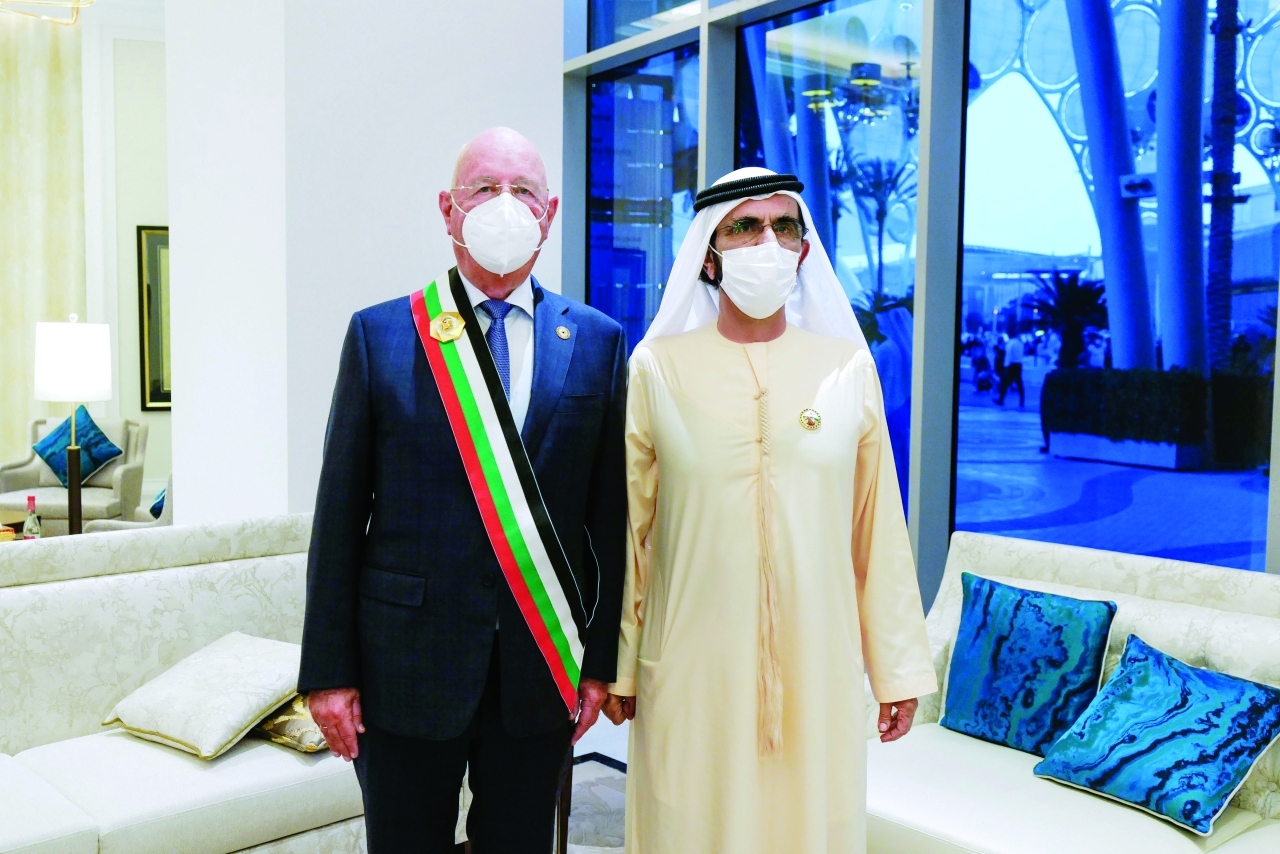 وقلد صاحب السمو الشيخ محمد بن راشد آل مكتوم خلال اللقاء البروفيسور كلاوس شواب، وشاح محمد بن راشد، في تكريم خاص لهذه الشخصية الدولية البارزة، لدوره الكبير في قيادة المنتدى الاقتصادي العالمي على مدى 50 عاماً، حقق خلالها المنتدى العديد من الإنجازات والنجاحات.