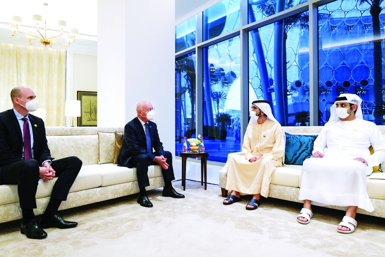 التقى صاحب السمو الشيخ محمد بن راشد آل مكتوم، نائب رئيس الدولة رئيس مجلس الوزراء حاكم دبي، رعاه الله، البروفيسور كلاوس شواب مؤسس ورئيس المنتدى الاقتصادي العالمي، في مقر إكسبو 2020 دبي.