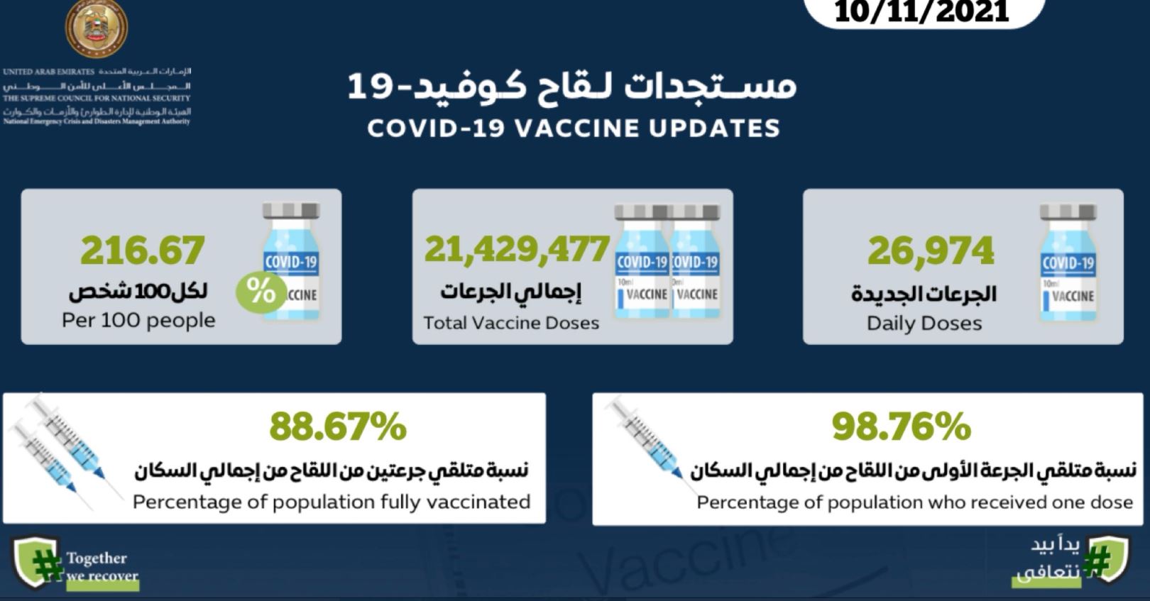 الإمارات تقدم 26,974 جرعة لقاح كوفيد19 البيانأعلنت الإمارات عن تقديم 26,974 جرعة من لقاح كوفيد19 خلال الـ24 ساعة الماضية، ليبلغ عدد الجرعات الكلي 21,429,477 بمعدل توزيع 216.67 جرعة لكل 100 شخص. وبنسبة 98.76% لمتلقي الجرعة الأولى، ونسبة 88.67% لمتلقي جرعتين من إجمالي السكان في دولة الإمارات.