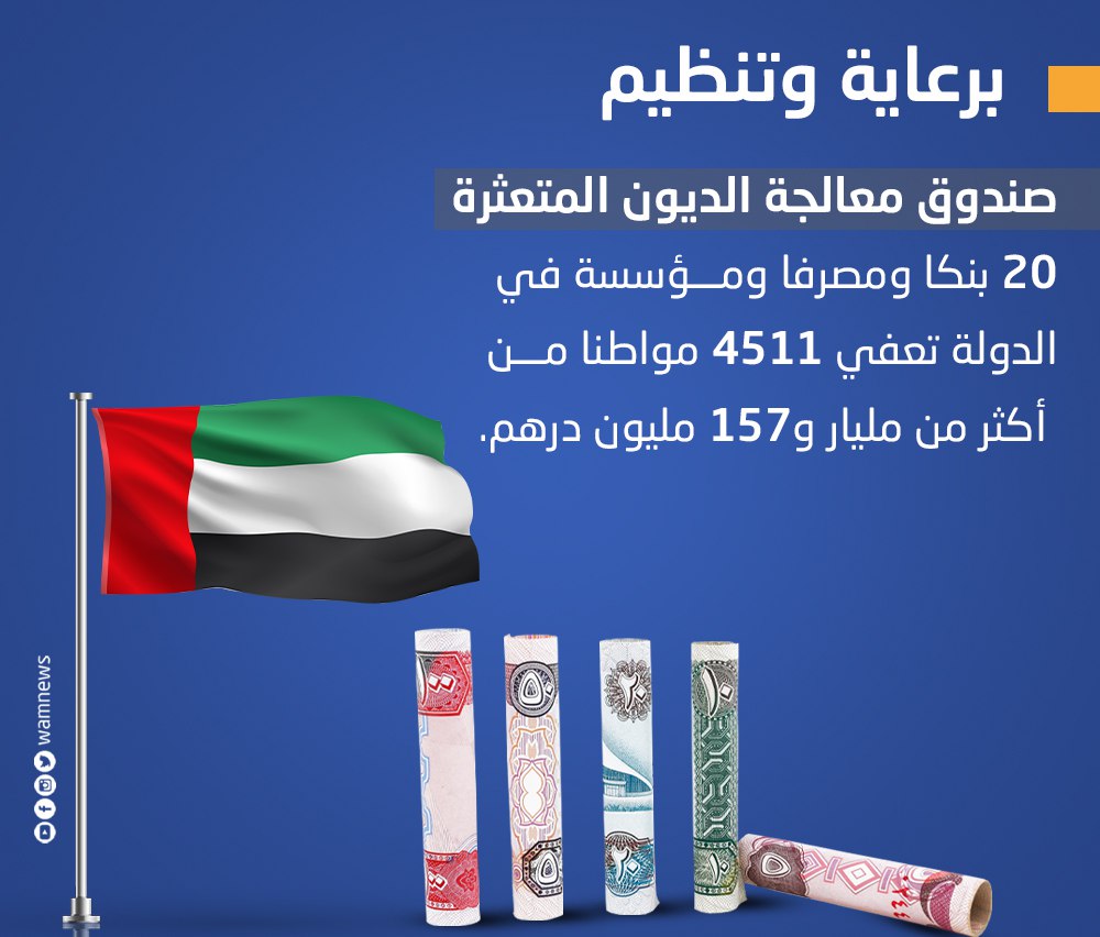 تنفيذا لتوجيهات صاحب السمو الشيخ خليفة بن زايد آل نهيان رئيس الدولة "حفظه الله"، ودعم صاحب السمو الشيخ محمد بن زايد آل نهيان ولي عهد أبوظبي نائب القائد الأعلى للقوات المسلحة ، ومتابعة سمو الشيخ منصور بن زايد آل نهيان نائب رئيس مجلس الوزراء وزير شؤون الرئاسة .. أعلن "صندوق معالجة الديون المتعثرة" عن قيام 20 بنكا ومصرفا ومؤسسة تمويل بإعفاء 4511 مواطنا من مديونياتهم، بقيمة إجمالية تبلغ أكثر من مليار و157 مليونا و388 ألف درهم.