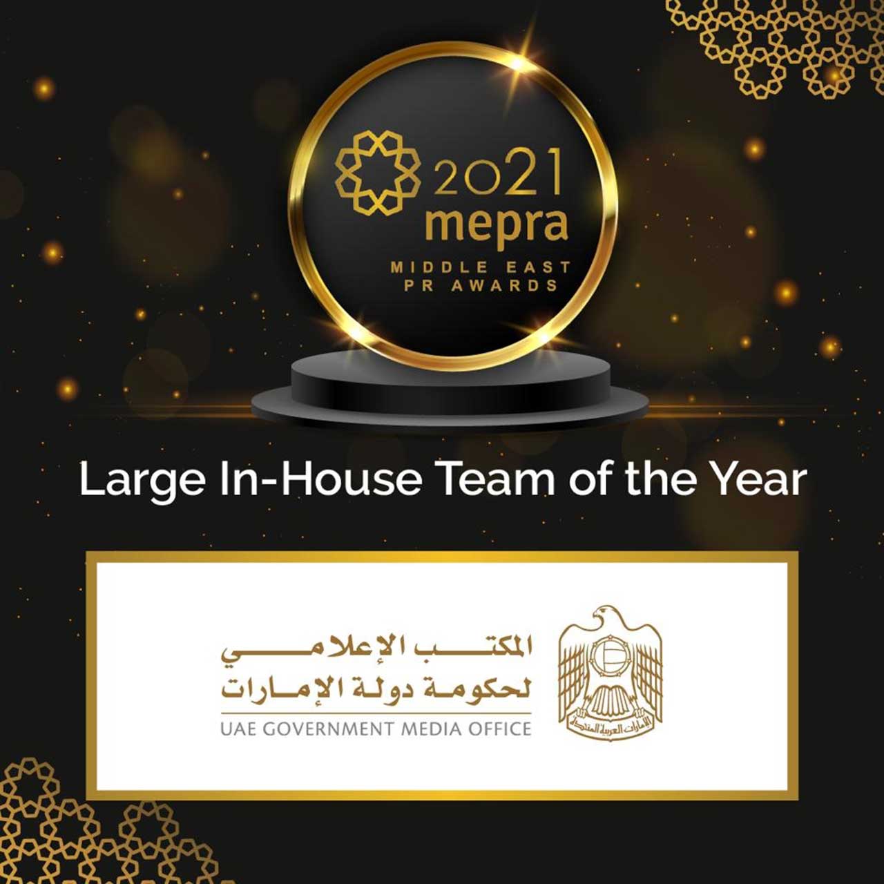 ونال المكتب الإعلامي جائزة "أفضل فريق داخلي في الشرق الأوسط " لعام 2021 من جوائز "ميبرا" من قبل لجان الجائزة، التي تضم العديد من خبراء الاتصال الجماهيري والإعلام والتسويق المرموقين من أنحاء العالم، وذلك تكريماً للدور الحيوي الذي لعبه فريق الاتصال بالمكتب في إنجاح مختلف الحملات الإعلامية التي قدمها المكتب الإعلامي لحكومة دولة الإمارات منذ بداية العام الجاري وواكب العديد من المشاريع الحكومية الاستراتيجية مثل حملة "أجمل شتاء في العالم" و"أول عد تنازلي عربي" التي واكب وصول مشروع الإمارات لاستكشاف المريخ "مسبار الأمل" إلى الكوكب الأحمر، و"مشاريع الخمسين" الاستراتيجية التي أطلقتها حكومة الإمارات لتؤسس لدورة تنموية جديدة في مختلف القطاعات للخمسين عاماً المقبلة.