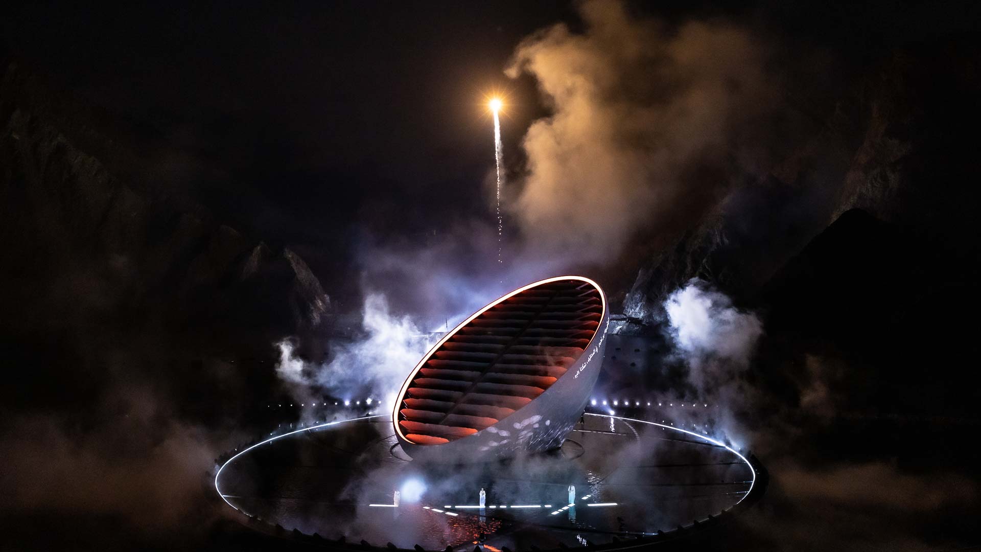 تلى تلك الإيقاعات صدى "الندبة" الذي تردد بين قمم الجبال – هذا الفن الجبلي القديم والصيحة الاحتفالية التقليدية التي تمتاز بها قبيلة الشحوح في دولة الإمارات العربية المتحدة- بدأت عندها المناظر الطبيعية في التحول لتشكّل آلة موسيقية لتأذن ببداية الاحتفال الرسمي بعيد الاتحاد الخمسين لدولة الإمارات العربية المتحدة.