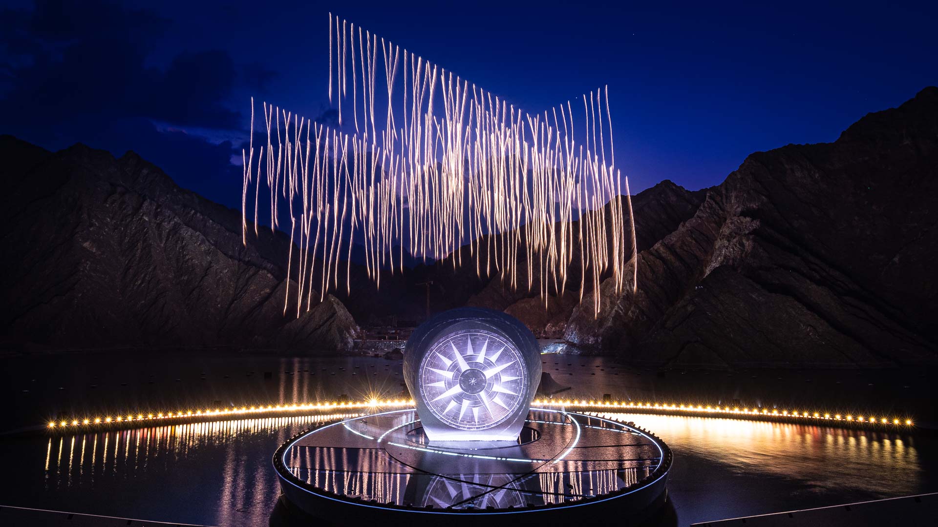 بدأ عرض عيد الاتحاد الخمسين مع الكشف عن 50 عازف طبل يتحلقون حول بحيرة بيضاوية تطفو على المياه العميقة في سد حتا. قدّم العازفون عزفاً إيقاعيًا متداخلاً يتردد صداه حول الجبال.