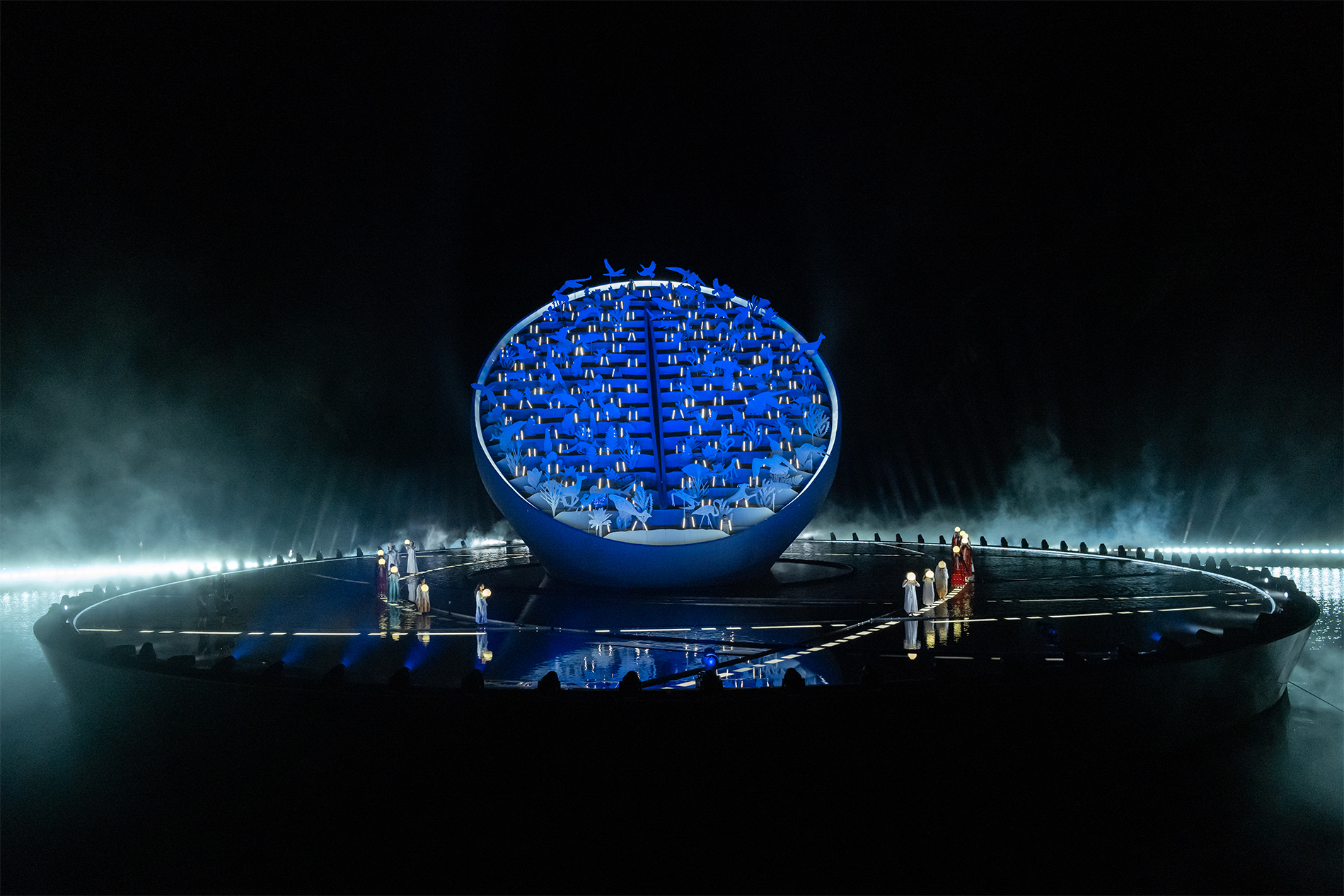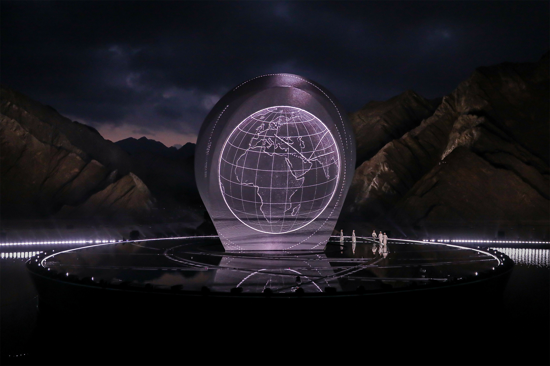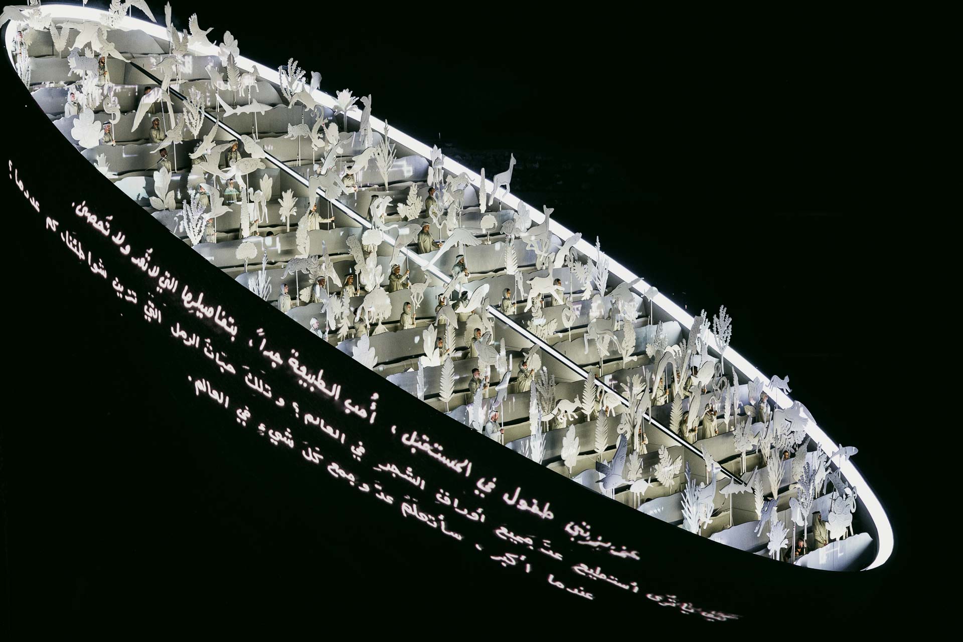 في هذه الأثناء، أضاء 200 درون السماء وأظهرت المنحوتة خطوطاً متوهجة تمثل علامات التجارة والسفر. ثم كشفت المنحوتة عن ديرة الدرور - النظام الفلكي القديم الذي استخدمه أهل الإمارات لتحديد الطقوس الموسمية المتوافقة مع الدورات الطبيعية.
