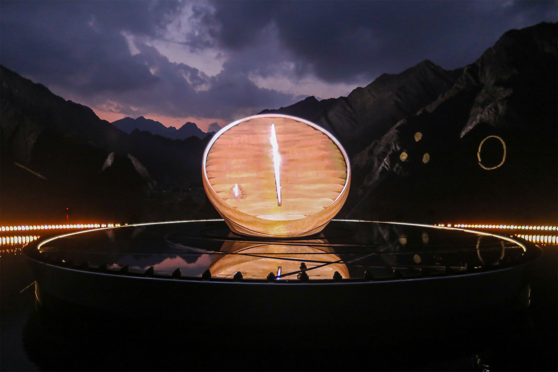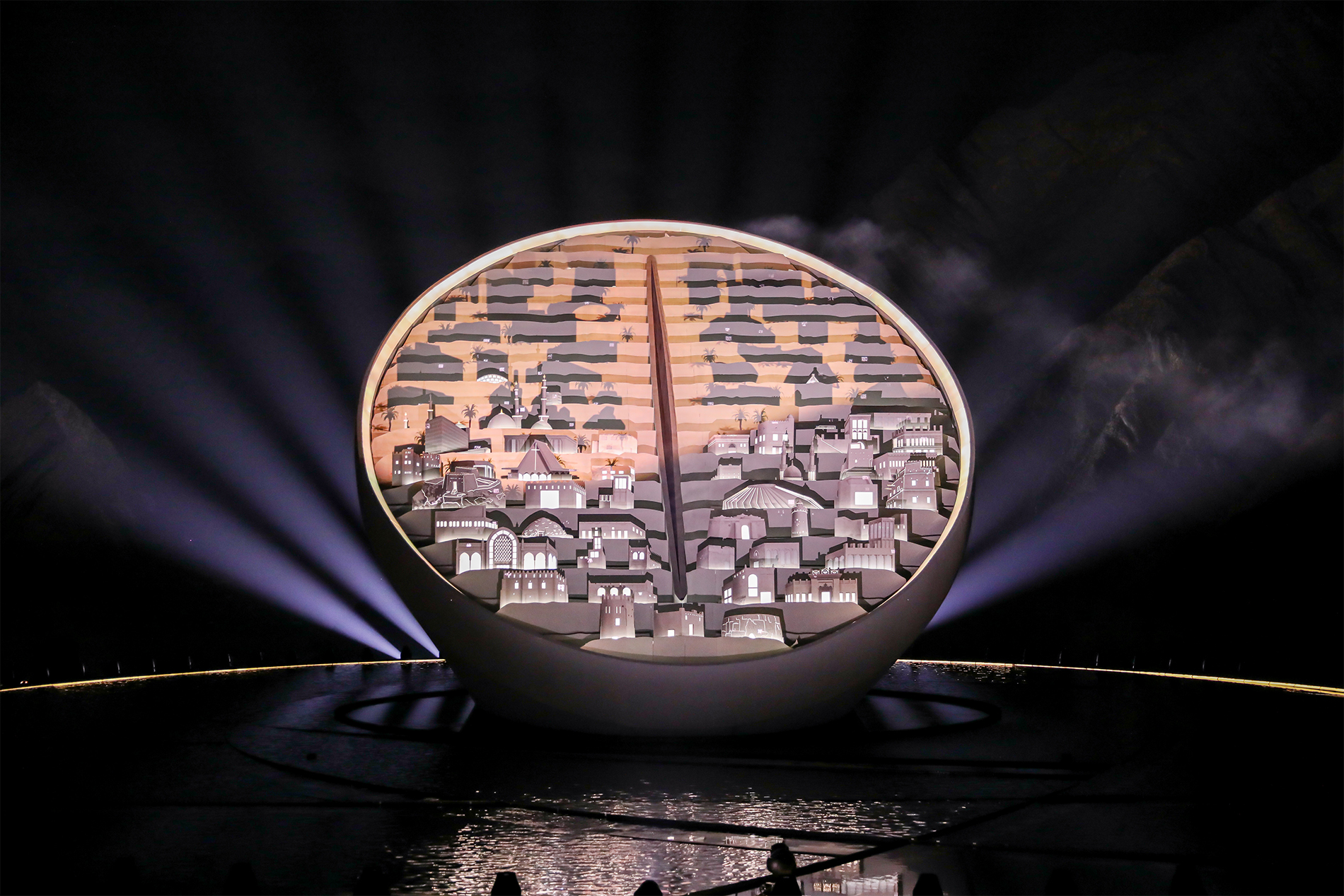 في عرض مذهل يجمع بين الموسيٍقى والمؤثرات البصرية تحوّلت المنحوتة إلى "ديرة"، لتستمر في التطور لتتحول إلى ساعة تأخذ الحاضرين والمشاهدين في رحلة عبر تاريخ الإمارات. انعكست لقطات أرشيفية على المنحوتة لتمثل اللحظات الرئيسية في تاريخ الدولة عبر الزمن، حتى وصولها هذه اللحظة متوجة تاريخ الإمارات باستضافة معرض إكسبو 2020 دبي.