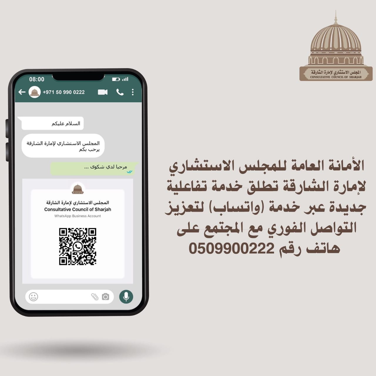 وأكد محمد عبدالجليل بوخلف مدير إدارة الاتصال بالمجلس الاستشاري لإمارة الشارقة بأن الأمانة العامة للمجلس وبمتابعة أحمد سعيد الجروان الأمين العام وبمباركة من علي ميحد السويدي رئيس المجلس أن يطلق خدمة جديدة عبر( واتساب) وتطبيق المجلس الاستشاري من خلال رقم هاتف 0509900222 والذي من شأنه أن يلقي إقبالا كبيرا من المتعاملين مع المجلس والراغبين في التواصل ، لتكون هذه الخدمة قادرة على تلبية احتياجات واستفسارات الجمهور وتلقي شكاويهم ومقترحاتهم والتي تعد من أبرز أعمال المجلس وأدواره الوطنية .
