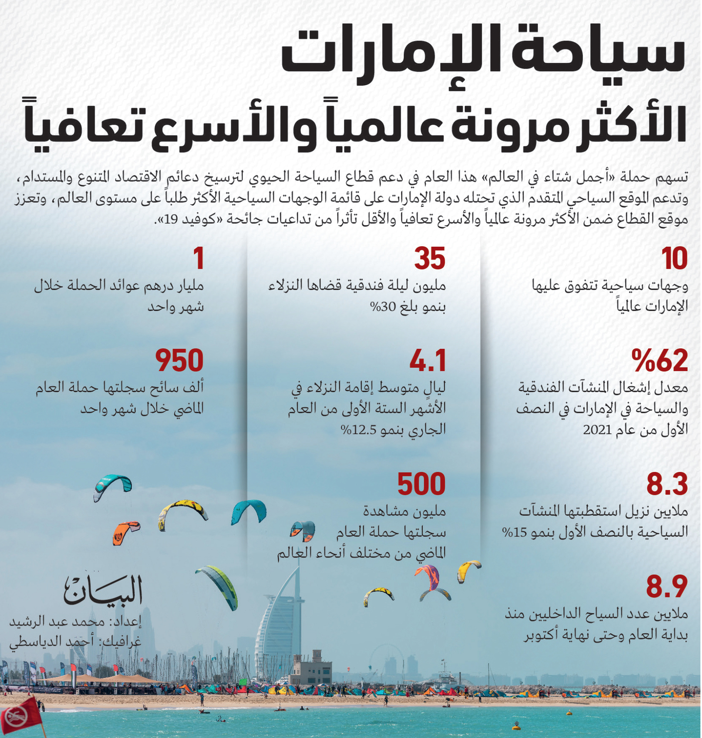 أسهمت حملة أجمل شتاء في العالم وتسهم هذا العام أيضاً في دعم قطاع السياحة الحيوي لترسيخ دعائم الاقتصاد المتنوع والمستدام، وتعزيز موقع القطاع ضمن الأكثر مرونة عالمياً والأسرع تعافياً والأقل تأثراً من تداعيات جائحة كوفيد 19، حيث ارتفع عدد السياح الداخليين إلى 8.9 ملايين نزيل منذ بداية العام 2021 وحتى نهاية أكتوبر مقارنة بـ6.2 ملايين نزيل للفترة نفسها من العام الماضي.