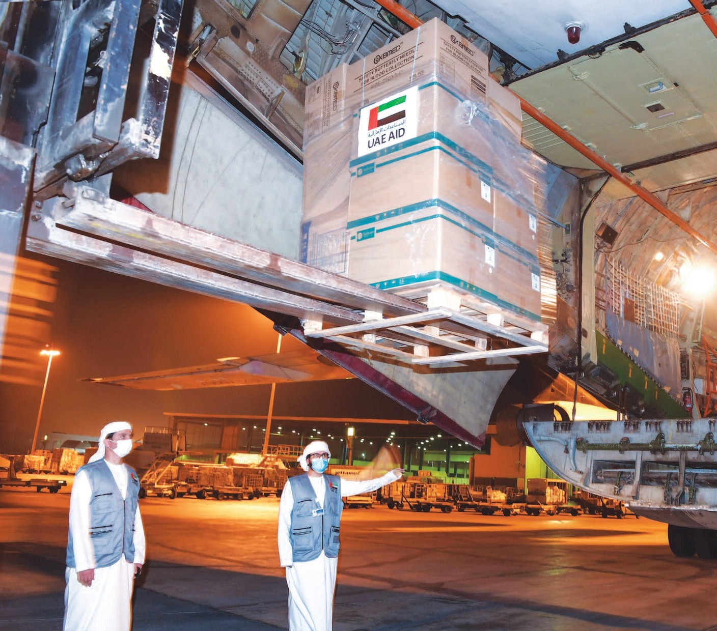 وبناءً على توجيهات صاحب السمو الشيخ خليفة بن زايد آل نهيان رئيس الدولة، حفظه الله، حافظت دولة الإمارات على التزاماتها ومسؤولياتها الإنسانية تجاه دول العالم، ودورها الإنساني في ظل التداعيات الجسيمة التي خلفتها جائحة كوفيد 19، وواصلت خلال العام 2021 تقديم المساعدات الطبية لأكثر من 137 دولة حول العالم، وبلغت حوالي 2300 طن من المساعدات الطبية ومعدات الحماية الشخصية والمستلزمات الطبية من السترات الوقائية والأقنعة الجراحية والمطهرات والمحاليل والقفازات والكمامات وأجهزة التنفس وأجهزة المسح، التي أسهمت بصورة كبيرة في تعزيز ودعم الخطوط الأمامية لمكافحة الفيروس في دول العالم.