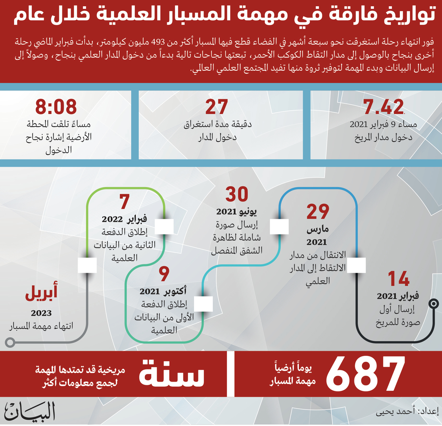 أطلق مشروع الإمارات لاستكشاف المريخ «مسبار الأمل» خلال عام مضى ومنذ دخوله بنجاح لمداره العلمي، حزمتين من البيانات العلمية، الأولى رصدت الفترة بين 9 فبراير و22 مايو، وأطلقت في 9 أكتوبر الماضي، فيما الثانية من 23 مايو إلى 31 أغسطس 2021، وأطلقت 7 فبراير الجاري، وتم خلالهما كشف ملاحظات غير مسبوقة عن الغلاف الجوي للكوكب الأحمر، تشير إلى وفرة الأكسجين الذري وأول أكسيد الكربون بصورة غير متوقعة في الغلاف الجوي العلوي للكوكب، فضلاً عن معلومات جديدة مهمة وغير مسبوقة ستساعد المجتمع العلمي العالمي على استحداث نماذج علمية أكثر دقة للغلاف الجوي للمريخ وتساهم في فهم أعمق لتغيراته.