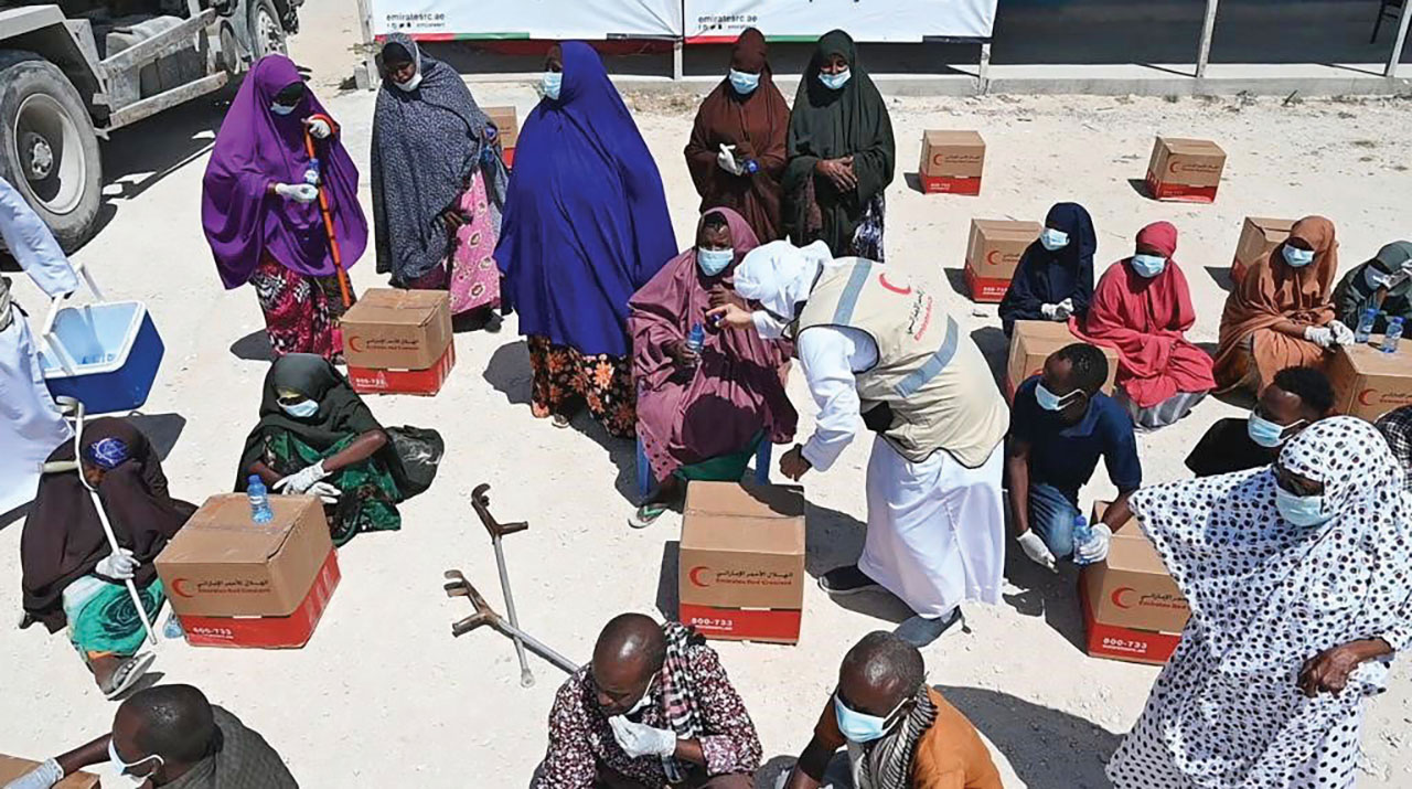ويتحرك وفد الهلال الأحمر الإماراتي في عدة اتجاهات، للحد من تفاقم معاناة المتأثرين من ظروف الجفاف، وتعزيز سبل الاستجابة الإنسانية لدرء المخاطر المحدقة بهم، فإلى جانب قوافله الإغاثية التي تجوب أحياء العاصمة وصولاً للنازحين في مخيماتهم التي تفتقر إلى الكثير من الأساسيات فإنه يعمل بقوة، لتحسين سبل الرعاية الشاملة خاصة للنساء والأطفال والشرائح الضعيفة.