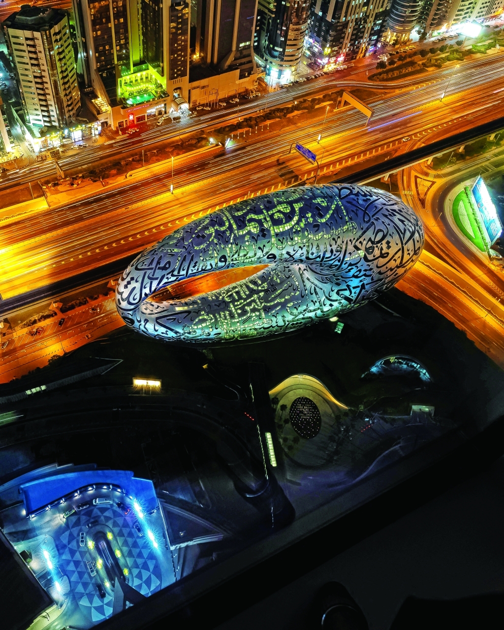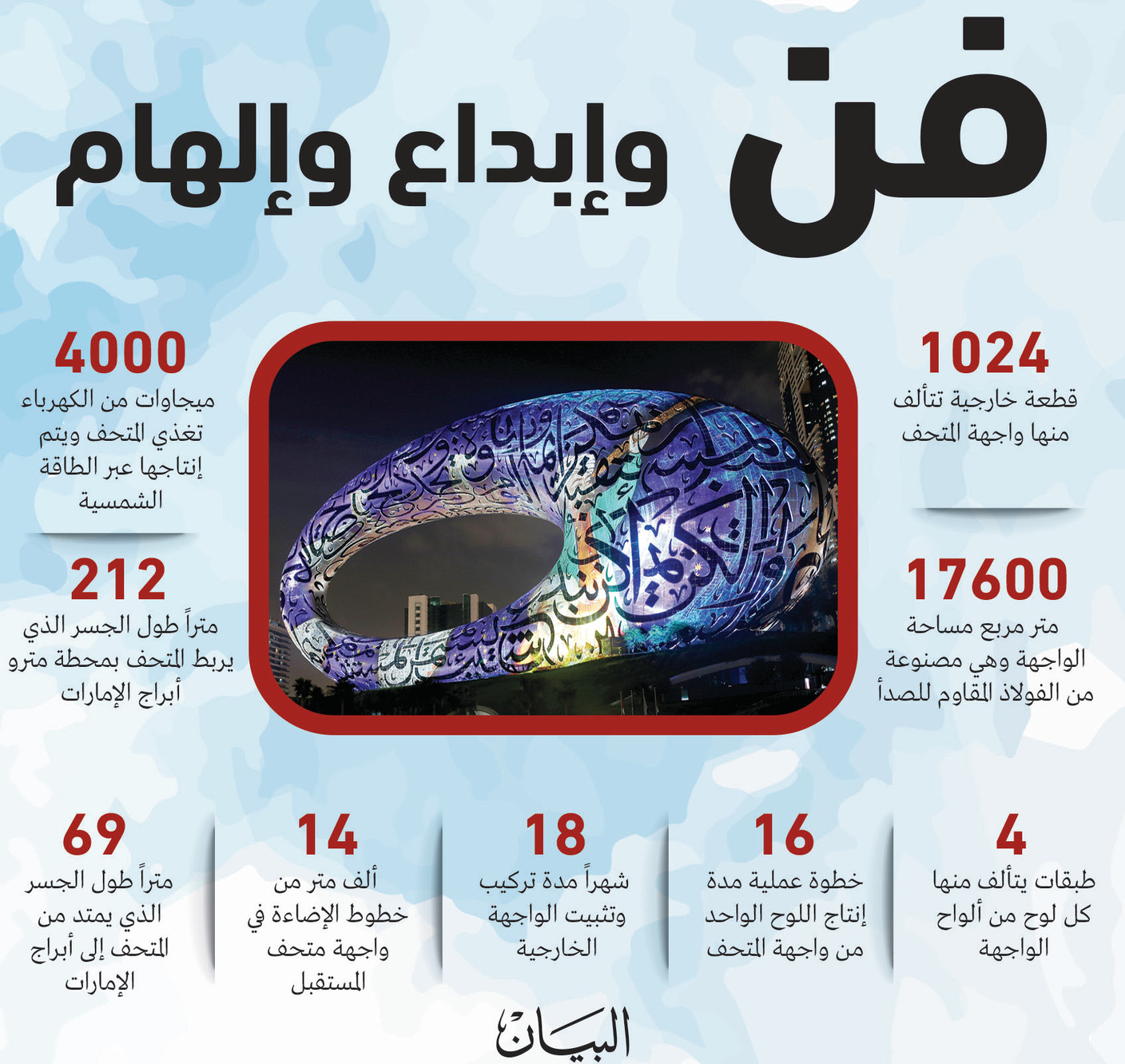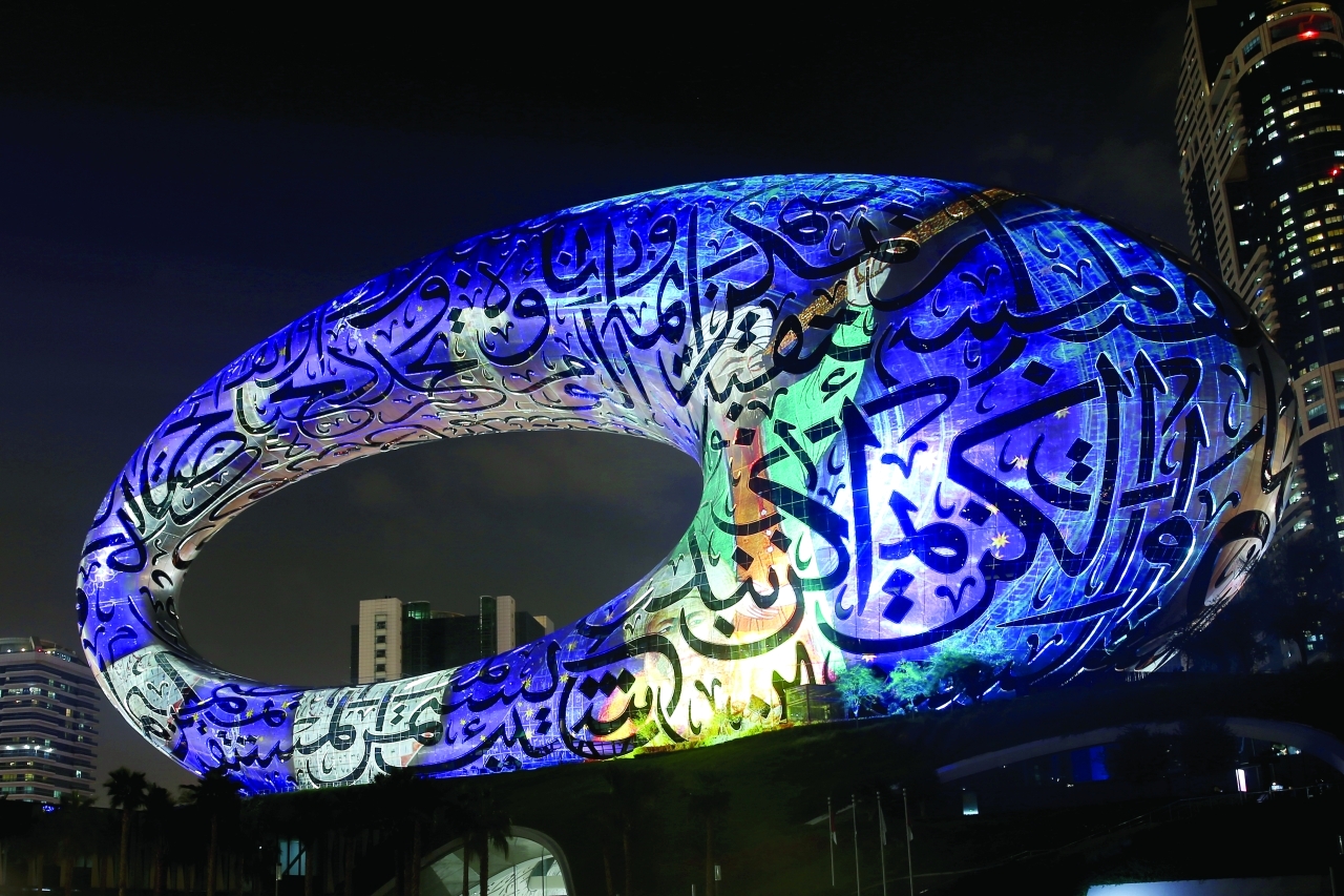 وتتم إضاءة واجهة متحف المستقبل بـ14 ألف متر من خطوط الإضاءة، مزينة باقتباسات ملهمة مكتوبة باللغة العربية لصاحب السمو الشيخ محمد بن راشد آل مكتوم نائب رئيس الدولة رئيس مجلس الوزراء حاكم دبي، رعاه الله، بالخط العربي، ما يجعله المبنى الأوحد في العالم الذي يعتمد «الكاليغرافي» (فن الخط) على واجهته بالكامل، وقد تم تصميم الكتابة المحفورة على الواجهة الفولاذية باستخدام زجاج متطور تم تصنيعه بتقنيات جديدة خصيصاً لتحسين جودة الإضاءة الداخلية والعزل الحراري الخارجي.