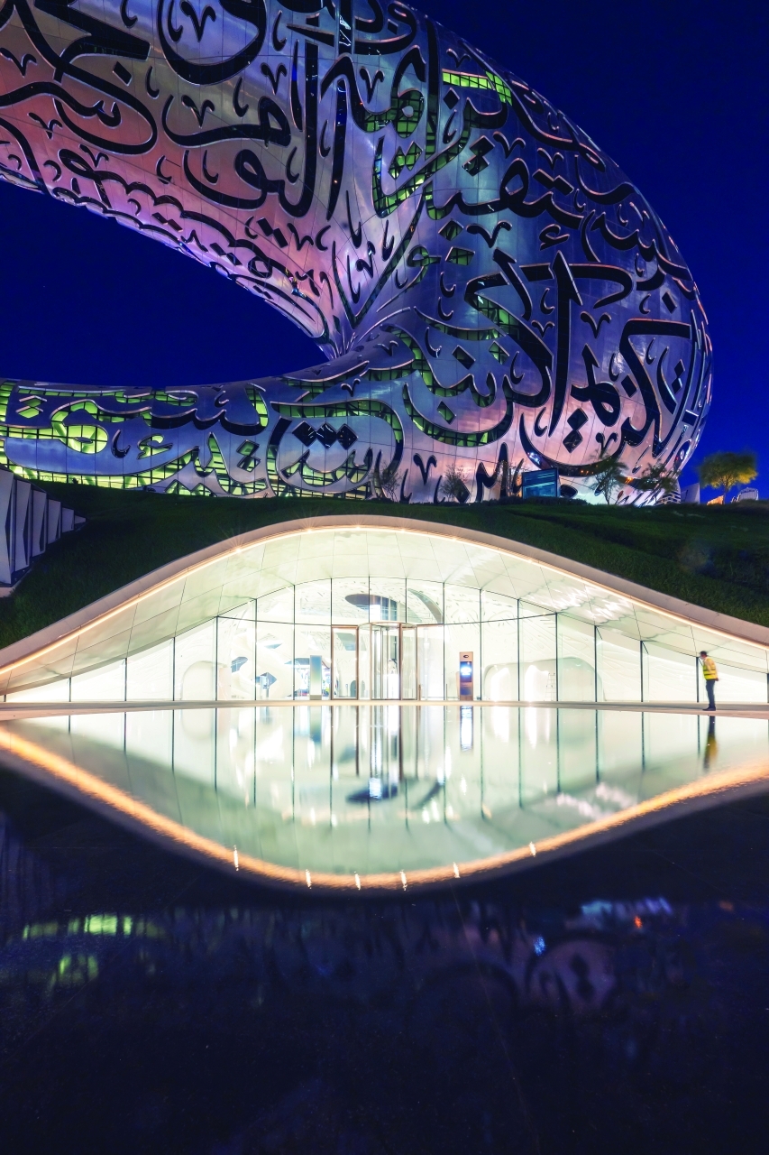 بالإضافة إلى ذلك، يأتي استخدام الخط العربي في تصميم واجهة متحف المستقبل تجسيداً لرؤية المتحف في المساهمة النوعية والفاعلة في استئناف الحضارة العربية في عصرها الذهبي، يوم أضاءت أنفاق التاريخ المظلمة، عبر تصدير علومها ومعارفها وإنجازاتها للبشرية بلغة الضاد.