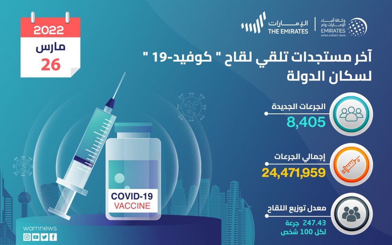 أعلنت وزارة الصحة ووقاية المجتمع تقديم 8,405 جرعات من لقاح "كوفيد-19" خلال الساعات الـ 24 الماضية وبذلك يبلغ مجموع الجرعات التي تم تقديمها حتى اليوم 24,471,959 جرعة ومعدل توزيع اللقاح 247.43 جرعة لكل 100 شخص.