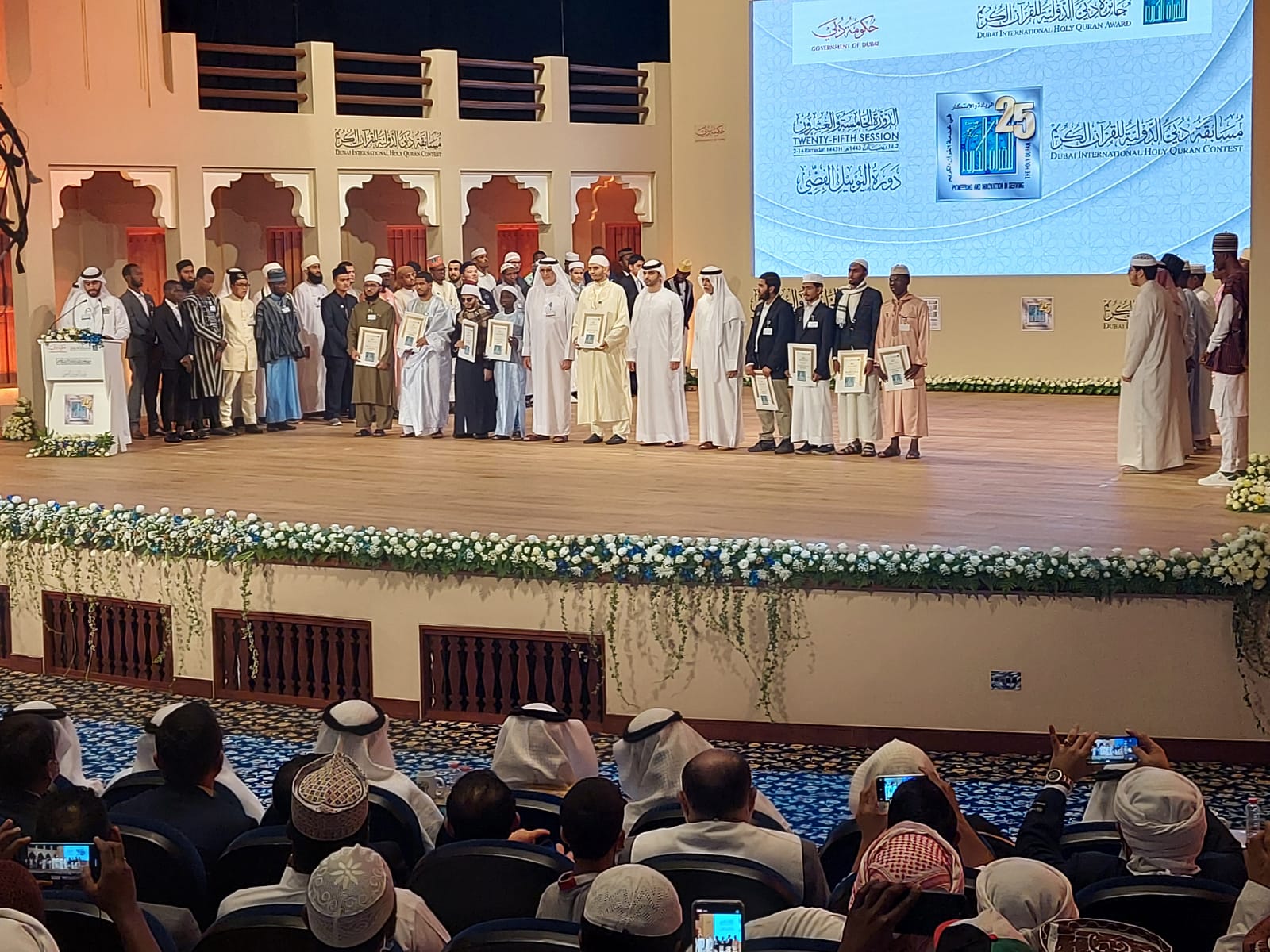 كما هنّأ سموه العشرة الأوائل في المسابقة، متمنياً لهم جميعاً التوفيق في خدمة كتاب الله، والمساهمة في التشجيع على حفظ القرآن الكريم.واحتفلت جائزة دبي الدولية للقرآن الكريم بختام الدورة الخامسة والعشرين من مسابقة دبي الدولية للقرآن الكريم بحضور سمو الشيخ منصور بن محمد بن راشد آل مكتوم، وجمع من مديري الدوائر والمؤسسات الحكومية وشبه الحكومية وأعضاء السلك الدبلوماسي والقنصلي وأعضاء اللجنة المنظمة لجائزة دبي الدولية للقرآن الكريم، وذلك في قاعة ندوة الثقافة والعلوم بدبي.